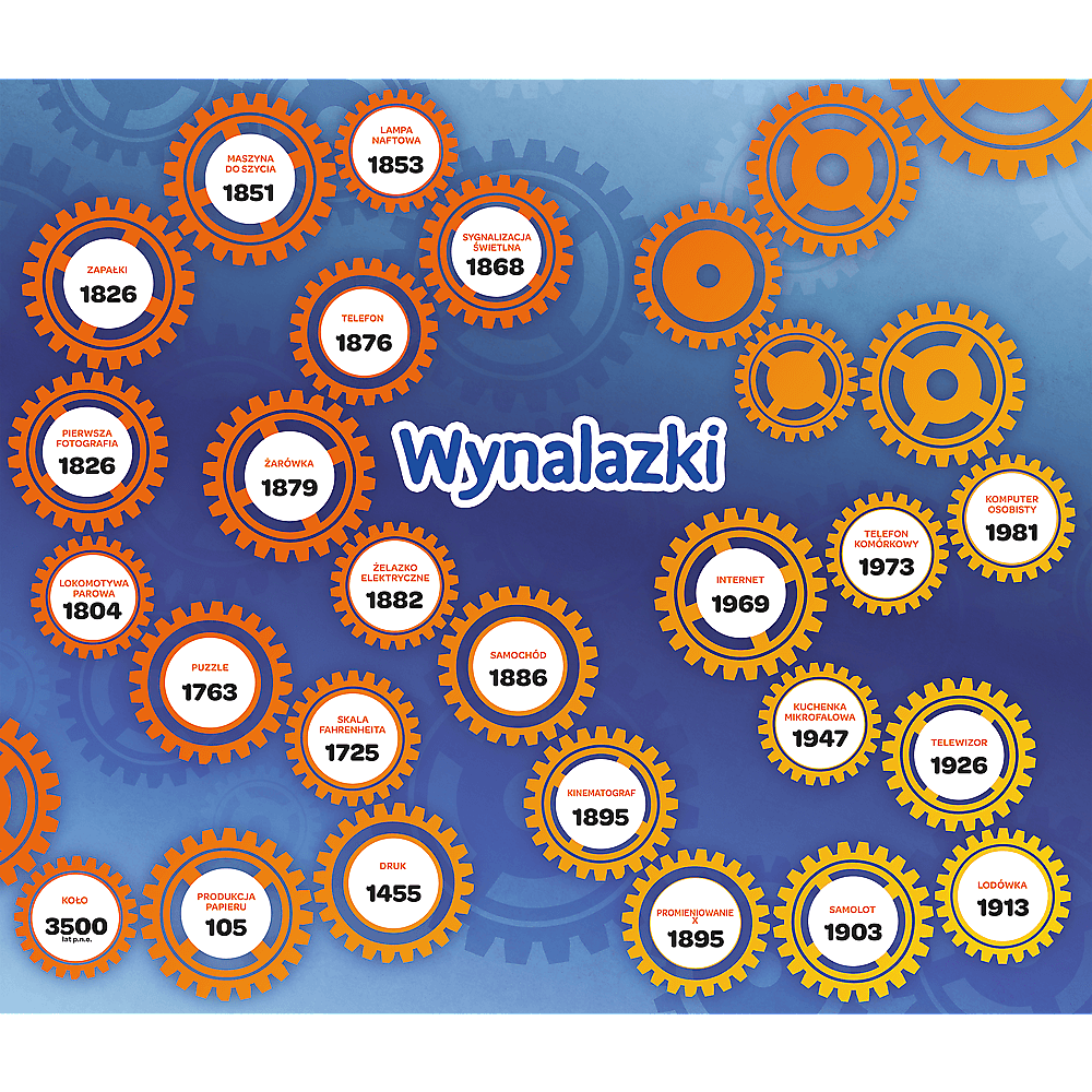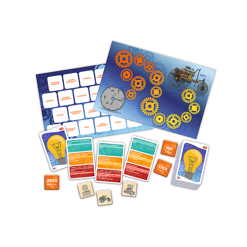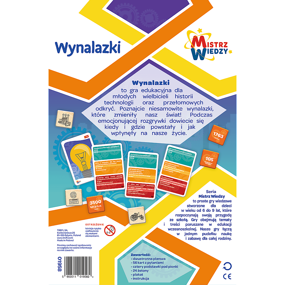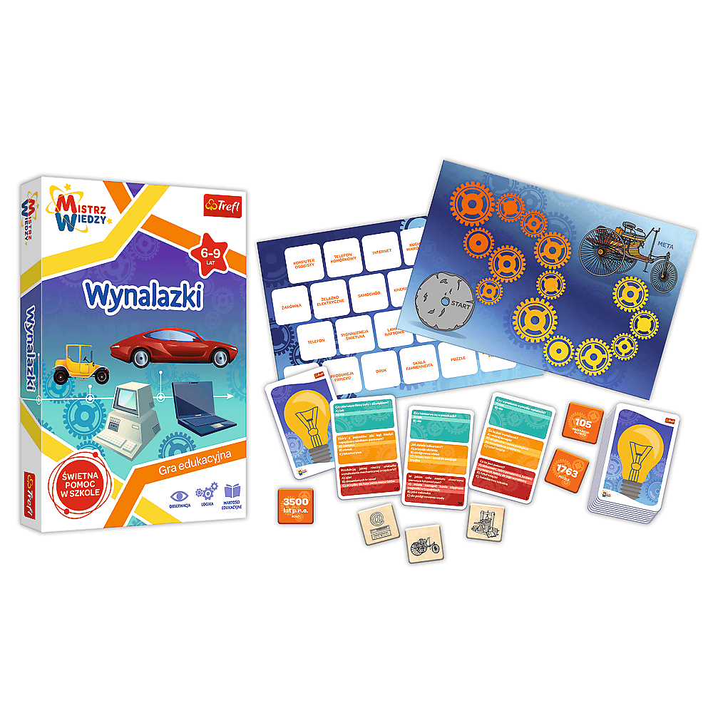 Mistrz Wiedzy Wynalazki to gra edukacyjna dla dzieci w wieku 6-9 lat.Wynalazki to gra edukacyjna już dla dzieci w wieku 6-9 lat, w której podczas dobrej zabawy dzieci poznają niesamowite wynalazki, które zmieniły nasz świat. Gra dla dzieci stanowi połączenie quizu, gry planszowej, układanki i memos oraz obejmuje tematy i treści poruszane w edukacji wczesnoszkolnej.Czy wiesz, gdzie wynaleziono koło? Kiedy i gdzie powstała pierwsza maszyna do szycia? Dołącz do gry i sprawdź swoją wiedzę z zakresu wynalazków! Ta gra edukacyjna dla dzieci to świetna metoda na połączenie nauki z zabawą. Poznaj najważniejsze wynalazki i zostań Mistrzem Wiedzy!Wynalazki to edukacyjna gra dla dzieci, która łączy quiz, grę planszową, układankę i memos oraz uczy o przełomowych odkryciach w dziejach ludzkości w przyjemny sposób. Cechy Gry:• Gra Edukacyjna, Rodzinna • Nauka przez zabawę• Proste zasady• Połączenie gry planszowej, quizu, układanki i gier typu memory• Idealna dla dzieci w wieku 6-9 lat.• Pomoc naukowa w edukacji wczesnoszkolnejGra rozwija: • Wiedzę dotyczącą wielkich odkryć• Pamięć i koncentrację• Pobudza ciekowość świata i zachęca do naukiPoznaj Gry Trefl i podziel się radością z rozgrywki.Gry planszowe to doskonały prezent z okazji urodzin, Dnia Dziecka lub pod choinkę. Świetnie sprawdzą się podczas spotkania towarzyskiego oraz chwil spędzanych w gronie rodzinnym. Zawartość pudełka:• 4 pionki• dwustronna plansza • 56 kart z pytaniami• 24 żetony ze znakami drogowymi• plakat edukacyjny.• InstrukcjaWymiary pudełka: 287x192x39Ilość Graczy: 2 -4Średni czas rozgrywki: 20 -30 minWiek: 6 -9