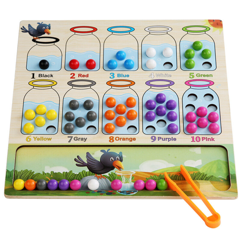 Zadaniem malucha jest chwytanie kolorowych kulek za pomocą dołączonej pęsety i umieszczanie ich w odpowiednich otworach na planszy. Ćwiczenie to rozwija koncentrację, cierpliwość, koordynację wzrokowo-ruchową oraz precyzję ruchów. Dzięki żywej kolorystyce gra wspiera także naukę rozpoznawania i nazywania kolorów, stając się świetnym wstępem do edukacji przedszkolnej.
