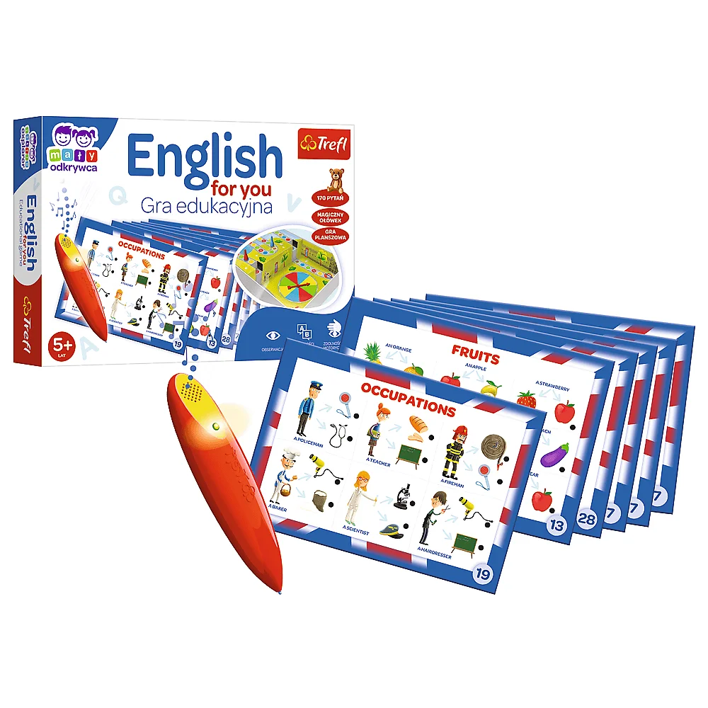 Trefl English for You – Mały Odkrywca i Magiczny Ołówek gra edukacyjna dla dzieci w wieku od 5. roku życia English for You to gra edukacyjna dla dzieci, dzięki której Mali Odkrywcy poznają podstawowe słownictwo w języku angielskim. Chwyć magiczny ołówek i ruszaj w językową podróż! Poznaj nazwy zawodów, nazwij ulubione owoce i poznaj nazwy pomieszczeń, jakie znajdują się w Twoim domu! Pięknie ilustrowane wydanie, plansza z tarczą losującą i wciągające propozycje zadań to przepis na udaną zabawę. English for You to połączenie gry planszowej i quizu. Poznasz zastosowanie angielskiego w naturalnych sytuacjach życiowych. Dołącz do gry i dogadaj się ludźmi na całym świecie! Seria Magiczny Ołówek została stworzona z myślą o jeszcze większym zaangażowaniu dzieci w proces nauki poprzez zabawę. Magiczny Ołówek wydaje sygnał dźwiękowy i świetlny, gdy na karcie z zadaniem obrazkowym zaznaczysz prawidłową odpowiedź. Cechy gry: • Gra edukacyjna, rodzinna • Nauka przez zabawę • Proste zasady • Idealna dla dzieci od 5. roku życia • Pomoc edukacyjna w przedszkolu i w klasach 1-3 Gra rozwija: • Znajomość języka angielskiego • Zdolności komunikacyjne • Spostrzegawczość oraz koordynacje wzrokowo-ruchową • Myślenie logiczne • Pamięć i koncentrację • Wyobraźnię i kreatywność Gry i zabawy językowe pomogą dzieciom stawiać pierwsze kroki w nauce języka obcego. Zestaw został przygotowany tak, by wspomagać rozwój poznawczy i intelektualny dziecka: zachęca do poznawania słownictwa i rozwija zdolności komunikacyjne w formie radosnej zabawy. English for You to idealna gra dla każdego malucha, aby rozpocząć przygodę z językiem angielskim! Poznaj Gry Trefl i podziel się radością z rozgrywki. Gry planszowe to doskonały prezent z okazji urodzin, Dnia Dziecka lub pod choinkę. Świetnie sprawdzą się podczas spotkania towarzyskiego oraz chwil spędzanych w gronie rodzinnym. Zawartość pudełka: • 32 plansze z zadaniami (16 dwustronnych kart) • magiczny ołówek • 4 pionki • instrukcja z propozycjami zabaw • planszę Wymiary pudełka: 330x227x55 Ilość Graczy: 1-4 Średni czas rozgrywki: 10-25 min Wiek: 5+