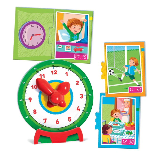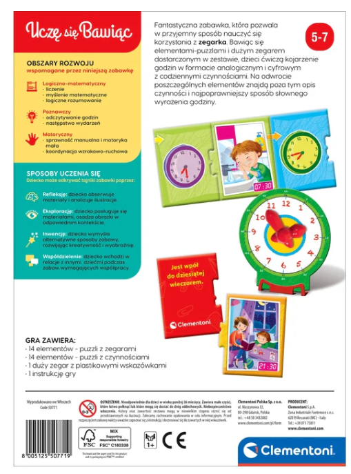 Bawiąc się elementami-puzzlami i dużym zegarem dostarczonym w zestawie, dzieci ćwiczą kojarzenie godzin w formacie analogicznym i cyfrowym z codziennymi czynnościami.