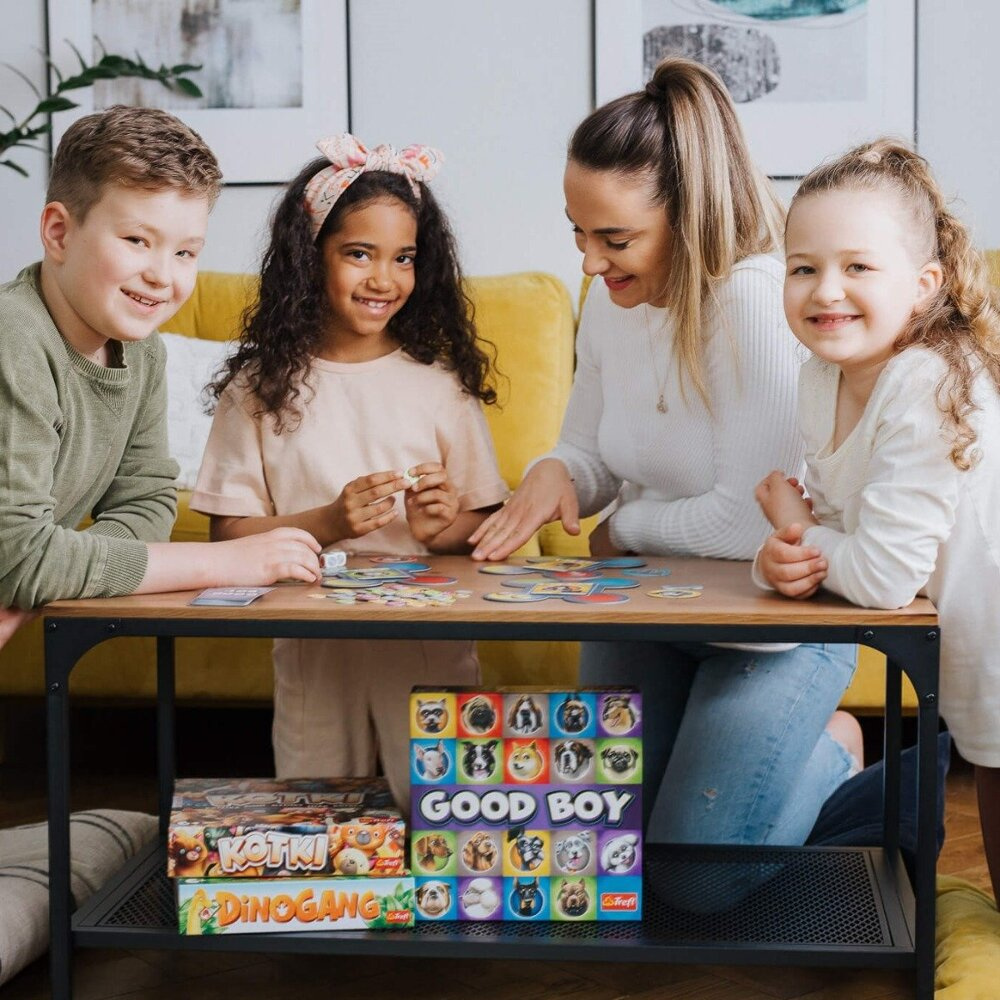 Trefl, Good Boy, rodzinna gra planszowa dla Dzieci od 6. roku życia Good Boy to rodzinna gra planszowa, w której będziecie wabić do siebie psiaki, bawiące się na podwórku. Rzucając kośćmi, pozyskujcie żetony fantów i wymieniajcie je na karty psów. Każda karta przynosi Wam punkty, a ten, kto zdobędzie ich najwięcej, otrzyma tytuł największego przyjaciela tych uroczych czworonogów! Wydaje się proste? Nic bardziej mylnego! Grę utrudnia niesforny kot, który rozprasza psy i może pokrzyżować Wam plany. Familijna gra planszowa, pełna niespodziewanych zwrotów akcji, przeznaczona jest dla 2-4 graczy w wieku powyżej 6. roku życia. Średni czas rozgrywki wynosi 30-60 minut. Idealny prezent dla każdego miłośnika psów! Cechy gry: • Gra rodzinna, dla najmłodszych • Idealna dla dzieci od 6. roku życia Gra rozwija: • Umiejętność logicznego myślenia • Zdolność zdrowej rywalizacji Poznaj Gry Trefl z Bobaskami i Misiem i podziel się radością z rozgrywki. Gry dla najmłodszych to doskonały prezent z okazji urodzin, Dnia Dziecka lub pod choinkę. Świetnie sprawdzą się podczas chwil spędzanych w gronie rodzinnym. Zawartość pudełka: • 28 kart z wizerunkami psiaków • 3 planszetki gracza • 60 żetonów fantów • 4 żetony psa/kota • 3 plansze podwórka • żeton pierwszego gracza • 2 kostki fantów • instrukcja Wymiary pudełka: 245x245x53 Ilość Graczy: 2-4 Średni czas rozgrywki: 30-60 min Wiek: 6+