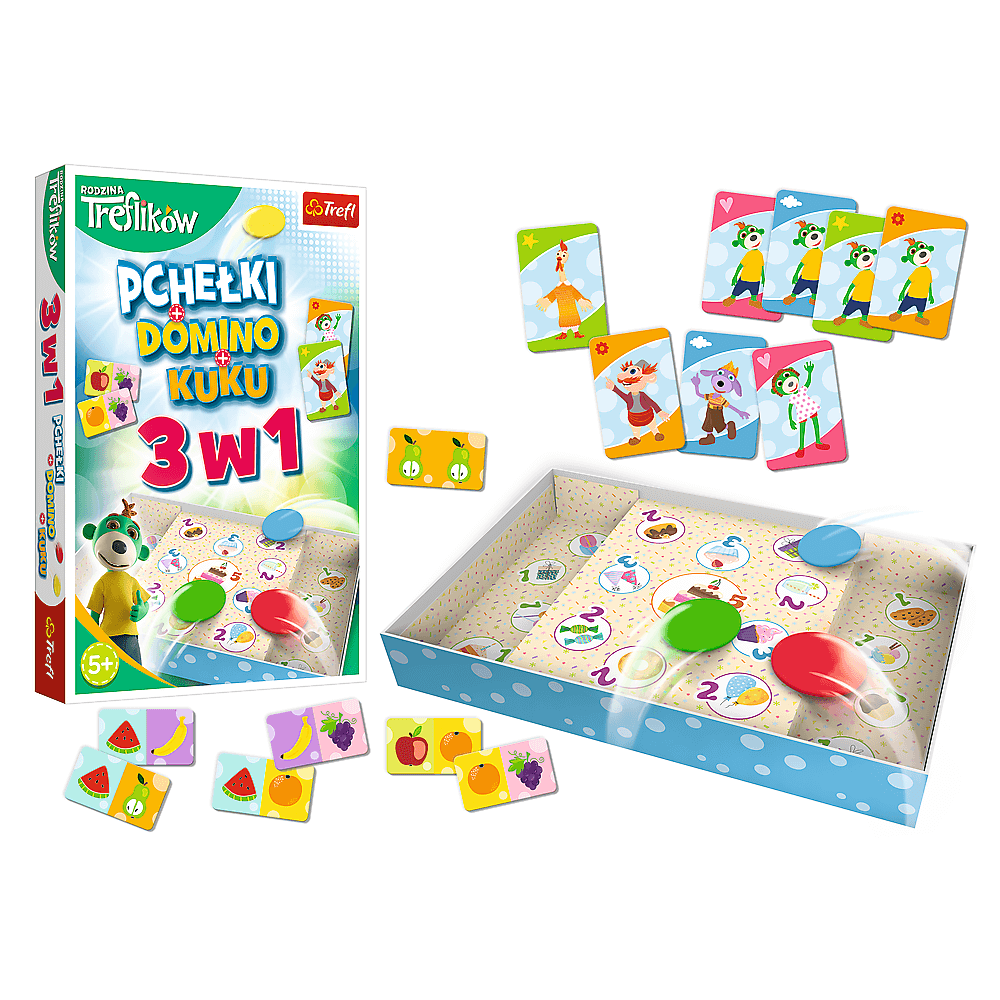 Gra Trefliki 3w1 Domino Pchełki Kuku z Bohaterami Bajki Rodzina Treflików.Zestaw gier 3 w 1 to świetna propozycja dla całej rodziny. Kolorowe Domino wprowadza dzieci w świat gier. Pchełki w nowej odsłonie rozwijają zręczność i celność. A popularna gra karciana Kuku to źródło emocjonującej rywalizacji, pełnej zabawnych zwrotów akcji. Piękne, kolorowe ilustracje z pewnością umilą wszystkim zabawę, a dzięki niewielkiemu pudełku, które dodatkowo pełni funkcję tarczy w grze w pchełki, możecie zabrać je ze sobą wszędzie i zagrać, kiedy tylko będziecie mieć na to ochotę!Produkt jest jedną z wielu propozycji zabawek z serii Rodzina Treflików – animowanego serialu dla dzieci. Rodzina Treflików to polska produkcja, tworzona metodą poklatkową w gdyńskim Studio Trefl. Serial jest emitowany w stacjach telewizyjnych w kraju i za granicą.Ulubione postaci z bajki w łatwy sposób wprowadzą Twoje dziecko w świat gier.Cechy Gry:• Zestaw 3 klasycznych gier: Pchełki, Domino, Kuku• Wiele wariantów zabawy• Szybka, dynamiczna rozgrywka.• Proste zasady• Idealna dla dzieci od 3 roku życia•Zabawa dla całej rodziny.Gra rozwija:• Zręczność i celność• Cierpliwość• Umiejętność podejmowania decyzji• Zdolność zdrowego współzawodnictwaPoznaj Gry Trefl i podziel się radością z rozgrywki.Gry planszowe to doskonały prezent z okazji urodzin, Dnia Dziecka lub pod choinkę. Świetnie sprawdzą się podczas spotkania towarzyskiego oraz chwil spędzanych w gronie rodzinnym. Zawartość pudełka:• 24 pchełki małe• 4 pchełki duże• 21 klocków domino• 28 kart• InstrukcjaWymiary pudełka: 287x192x39Ilość Graczy: 2 -4Średni czas rozgrywki: 25 -35 minWiek: 5+