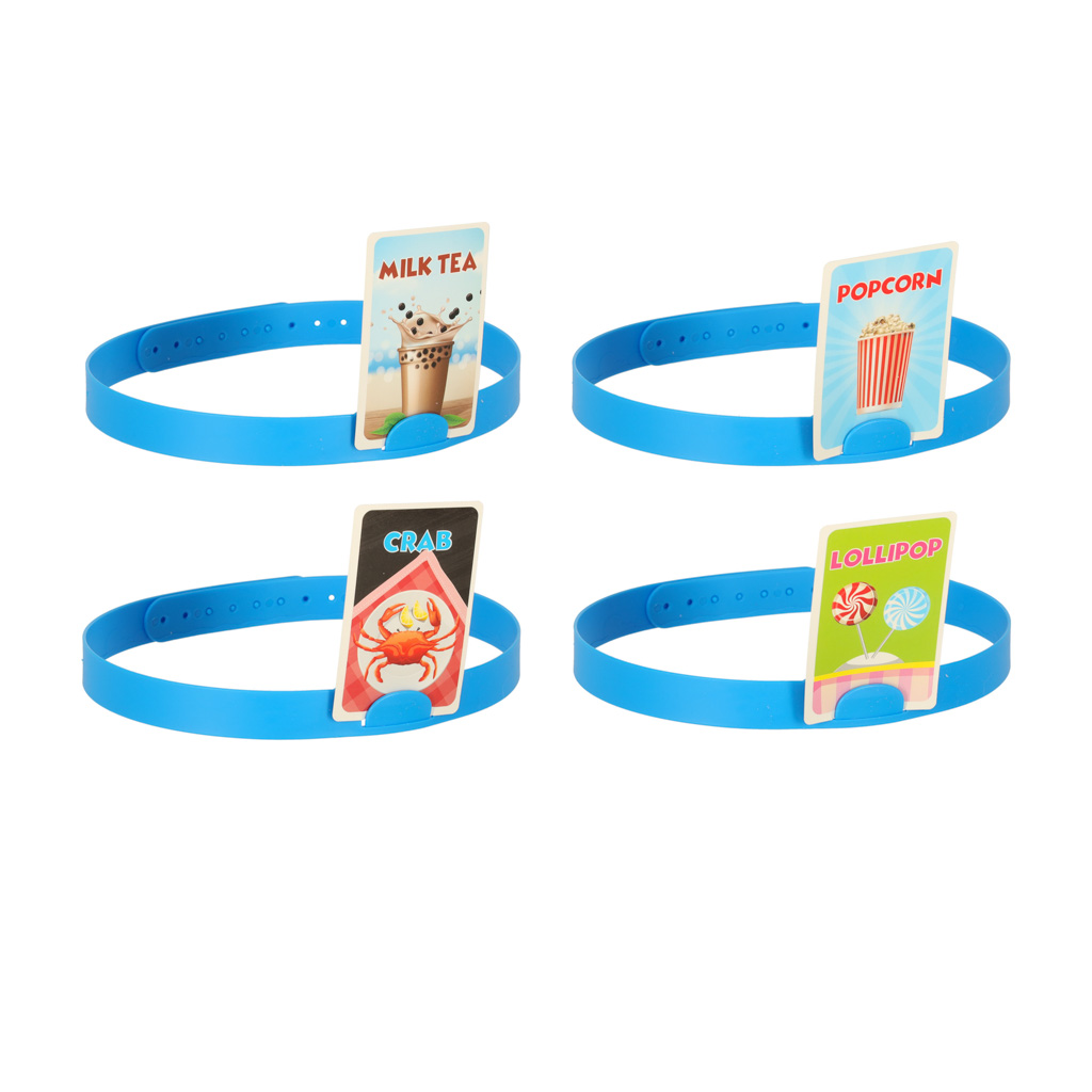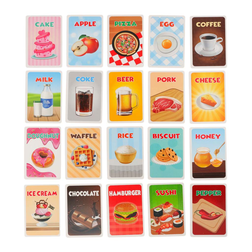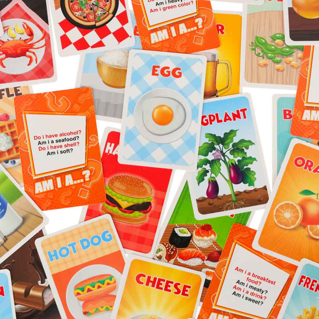 Zestaw zawiera 54 karty z różnorodnymi obrazkami jedzenia, 4 opaski na głowę, 20 żetonów oraz klepsydrę, która dodaje dynamiki grze. Bądź szybki w zadawaniu pytań i odkryj, co kryje się na Twojej karcie!