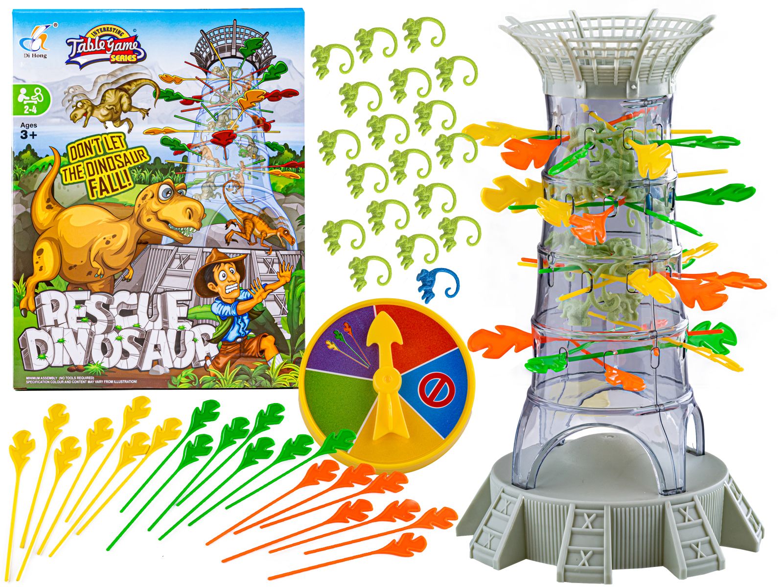 Na każdym z kilku poziomów wieży układamy gałęzie. Z góry w otwór wieży wrzucamy wszystkie dinozaury tak, aby zawisły na gałęziach / bierkach. Jeżeli któryś dinuś spadnie na podstawę, podnosimy go i wrzucamy od góry aż wszystkie będą wisiały na gałęziach. Po rozpoczęciu gry, każdy gracz losuje na tarczy kolor i ostrożnie wyciąga słomkę w kolorze, który wylosował. Dinozaury, które spadną na sam dół, gracz kładzie przed sobą. Na koniec gry podliczamy nasze dinozaury.