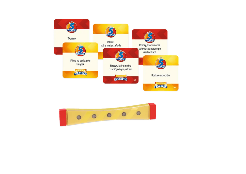 5 sekund SZTAFETA to jeszcze bardziej spontaniczna i nieprzewidywalna odsłona kultowej gry, w której szybko myślisz i szybko mówisz. Przeczytaj na głos hasło z karty, wykrzycz odpowiedzi i podaj pałeczkę wybranemu przez siebie graczowi.