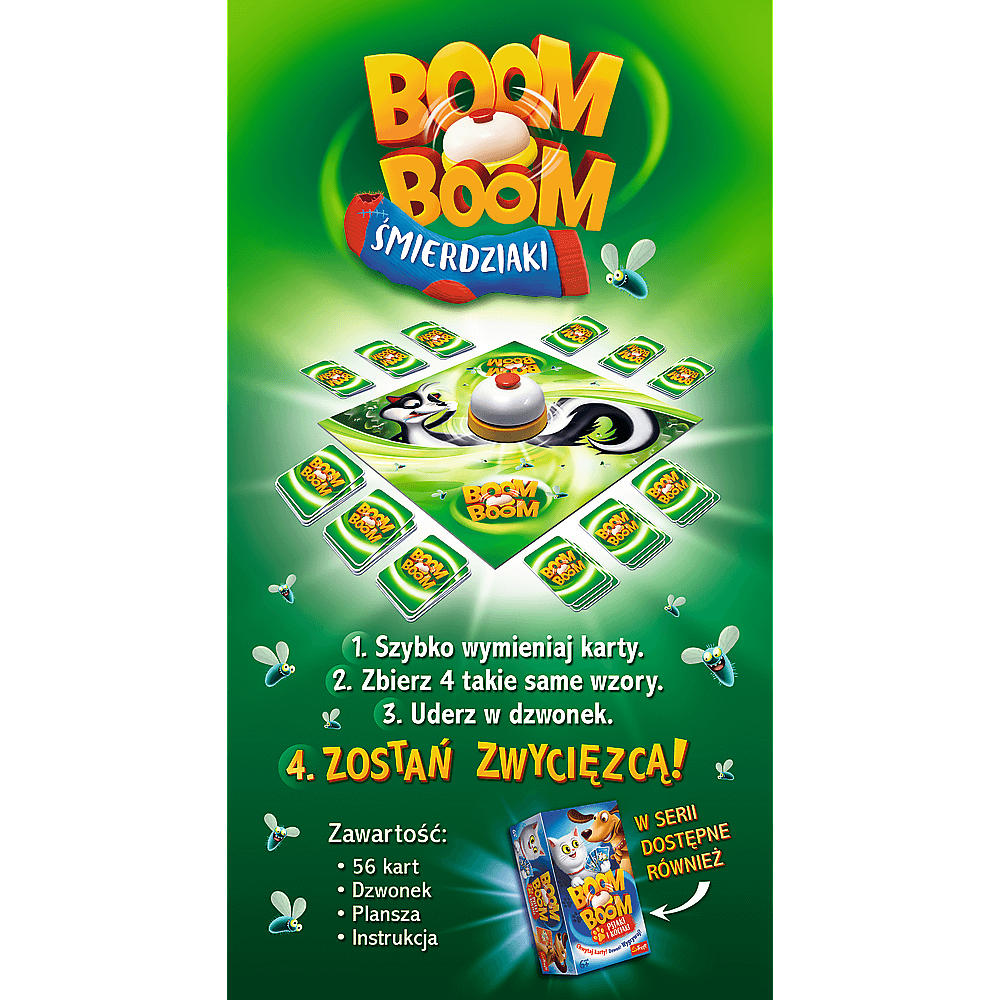 Trefl, Boom Boom, Śmierdziaki Rodzinna Gra Karciana dla Dzieci od 6 latBoom Boom to szalona gra karciana! Myśl i działaj błyskawicznie! Wymieniaj karty, zbieraj zestawy i uderzaj w dzwonek! Wygrywa najszybszy uczestnik gry!Masz dosyć nudy? Boom Boom Śmierdziaki to niezwykle dynamiczna rozgrywka pełna fantastycznej zabawy. Wykaż się refleksem i spostrzegawczością. Działaj szybko, nie ma ani chwili do stracenia! W Boom Boom wszyscy grają jedocześnie. Wygrywa ten, kto pierwszy zbierze wszystkie potrzebne karty. W grze Boom Boom gracze kompletują zestawy tych zestawy tych samych Śmierdziaków, wymieniając jednocześnie swoje karty z kartami na planszy. Po złapaniu 4 takich samych Śmierdziaków gracz uderza w dzwonek i sygnalizuje zebranie gotowego stosu. Gracze mogą polować na karty tego samego typu, dzięki czemu rozgrywka jest jeszcze bardziej emocjonująca. Zbierze wszystkie zestawy Śmierdziaków i zostań zwycięzcą!Boom Boom Śmierdziaki to dynamiczna gra karciana, w której gracze kompletują zestawy tych zestawy tych samych Śmierdziaków zaś wykonanie zadania oznajmiają uderzeniem w dzwonek.Cechy Gry: • Gra Rodzinna • Szybka rozgrywka, wszyscy grają jednocześnie!• Proste zasady• Idealna dla dzieci od 6 roku życiaGra rozwija:• Umiejętność szybkiego myślenia• Koordynacje ręka-oko• Zdolność zdrowej rywalizacjiPoznaj Gry Trefl i podziel się radością z rozgrywki.Gry planszowe to doskonały prezent z okazji urodzin, Dnia Dziecka lub pod choinkę. Świetnie sprawdzą się podczas spotkania towarzyskiego oraz chwil spędzanych w gronie rodzinnym. Zawartość pudełka:• 56 kart• dzwonek• plansza• instrukcja w 5 językach: PL, CZ, SK, HU, ROWymiary pudełka: 260x145x100Ilość Graczy: 2 -4Średni czas rozgrywki: 10 -20 minWiek: 6+