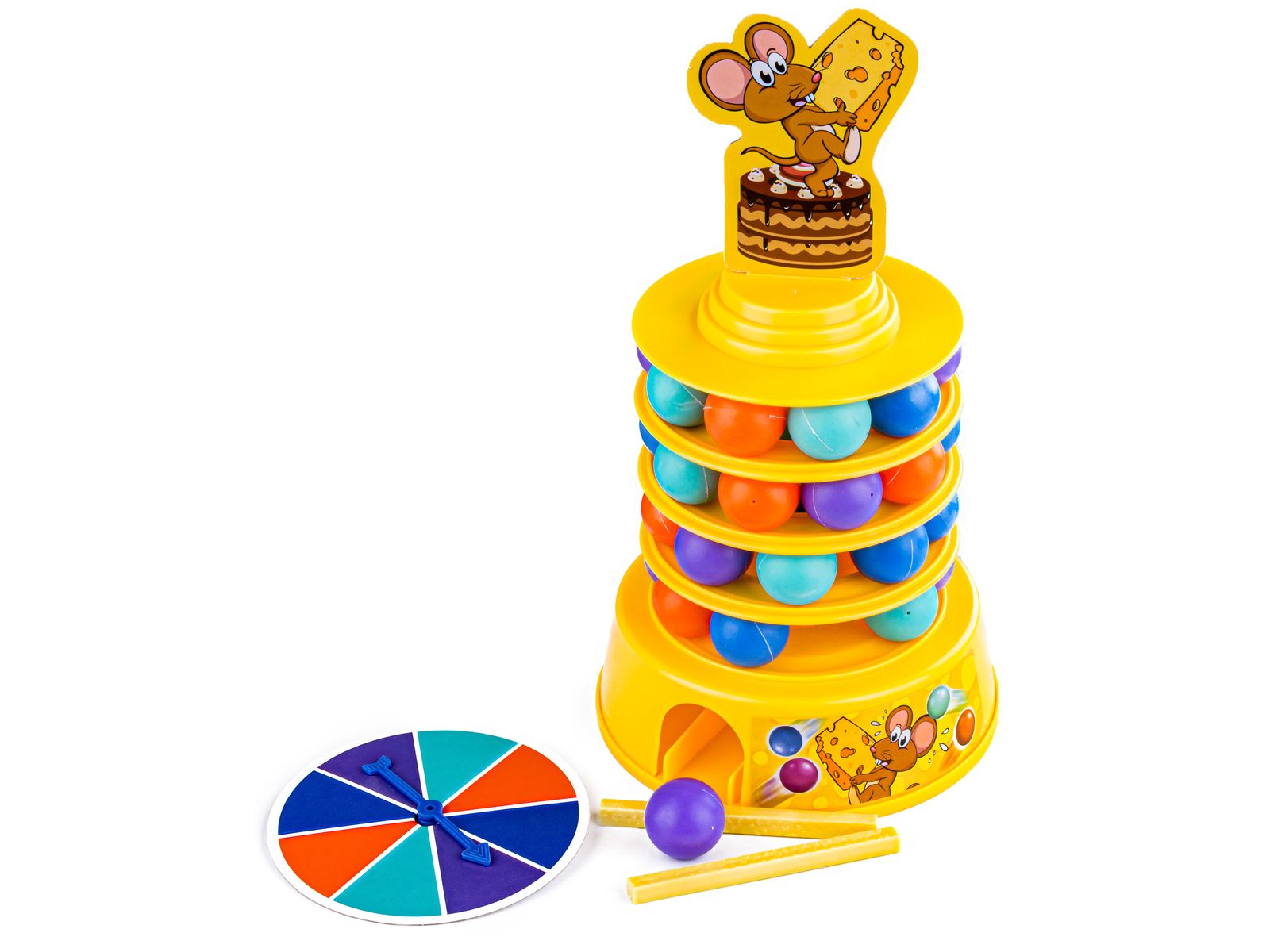 nasz chwiejący się tort. Posłuży nam do tego podstawa, na której układamy kolorowe piłeczki. Następnie nakładamy kolejne warstwy talerzy i piłeczek. Tort wieńczymy przykryciem z wesołą myszką. Zabawa polega na wciskaniu do środka naszej wieży piłeczki w wylosowanym wcześniej kolorze. Cała konstrukcja jest ruchoma i niestabilna więc to wcale nie takie proste zadanie. Przegrywa osoba, która przewróci tort i doprowadzi do upadku myszki.