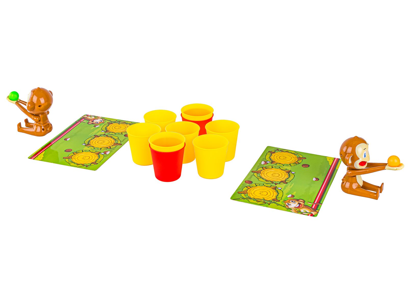 Zasady gry:Gracze rozstawiają żółte kubeczki tworząc kółko (dwa czerwone kubeczki są ukryte pod żółtymi - zgodnie z układem pokazanym na instrukcji). Następnie ustawiają plansze naprzeciw kubeczków oraz małpki obrócone tyłem do kubeczków, przodem do gracza. Każdy uczestnik dysponuje taką samą ilością kokosów w wybranym wcześniej kolorze. Młodszy gracz rozpoczyna zabawę. Aby dokonać strzału należy umieścić orzech na łapkach małpki i nacisnąć na nie (nasza małpka zadziała jak mini katapulta). Celem jest trafienie w kubeczek. Jeśli graczowi uda się trafić w kubeczek, zabiera go i stawia na swojej planszy w miejscu narysowanych 3 pniaków drzew (nie wyjmujemy kokosa z kubeczka). Następnie kolejny uczestnik podejmuje próbę. Trafienie w czerwony kubeczek daje nam szansę oddania ponownego strzału. Dodatkowo nie musimy się ograniczać do strzelania w wolne kubeczki, równie dobrze możemy przejąć kubeczki przeciwnika. Kokosy, które zostały wykorzystane przez zawodnika ale nie trafiły do kubeczka mogą zostać ponownie wykorzystane. | ![]() |