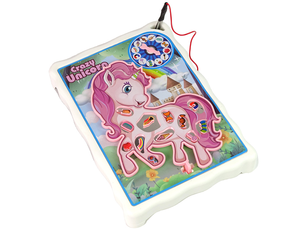 Na planszy znajduje 12 różnych miejsc na ciele jednorożca na którym należy położyć małe elementy/ jedzenie. Zakręć kołem, sprawdź co wskaże strzałka. Dany przedmiot spróbuj ostrożnie wyciągnąć z danej części. Ale uważaj! Wystarczy, że lekko dotkniesz powierzchni jednorożca, a on zadrży, zacznie brzęczeć i przegrywasz. Spróbuj go nie obudzić.