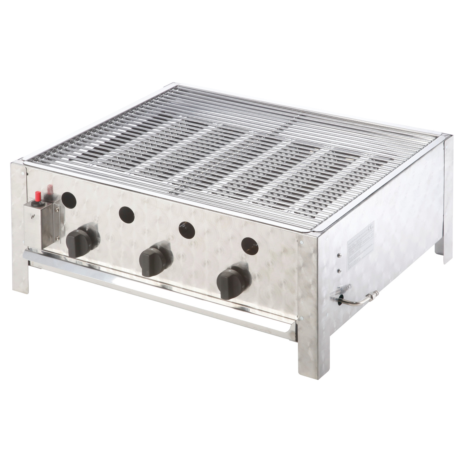 Grill gazowy gastronomiczny 3 - palnikowy z rusztem RASCAL 10 kW to doskonały wybór dla profesjonalnych kuchni, które potrzebują wydajnego i funkcjonalnego sprzętu. Dzięki mocy 10 kW oraz trzem niezależnie regulowanym palnikom, możliwe jest równoczesne przygotowanie różnych potraw, co znacznie przyspiesza proces gotowania. Urządzenie jest wyposażone w elektryczny piezo zapalnik, co zwiększa komfort jego użytkowania.