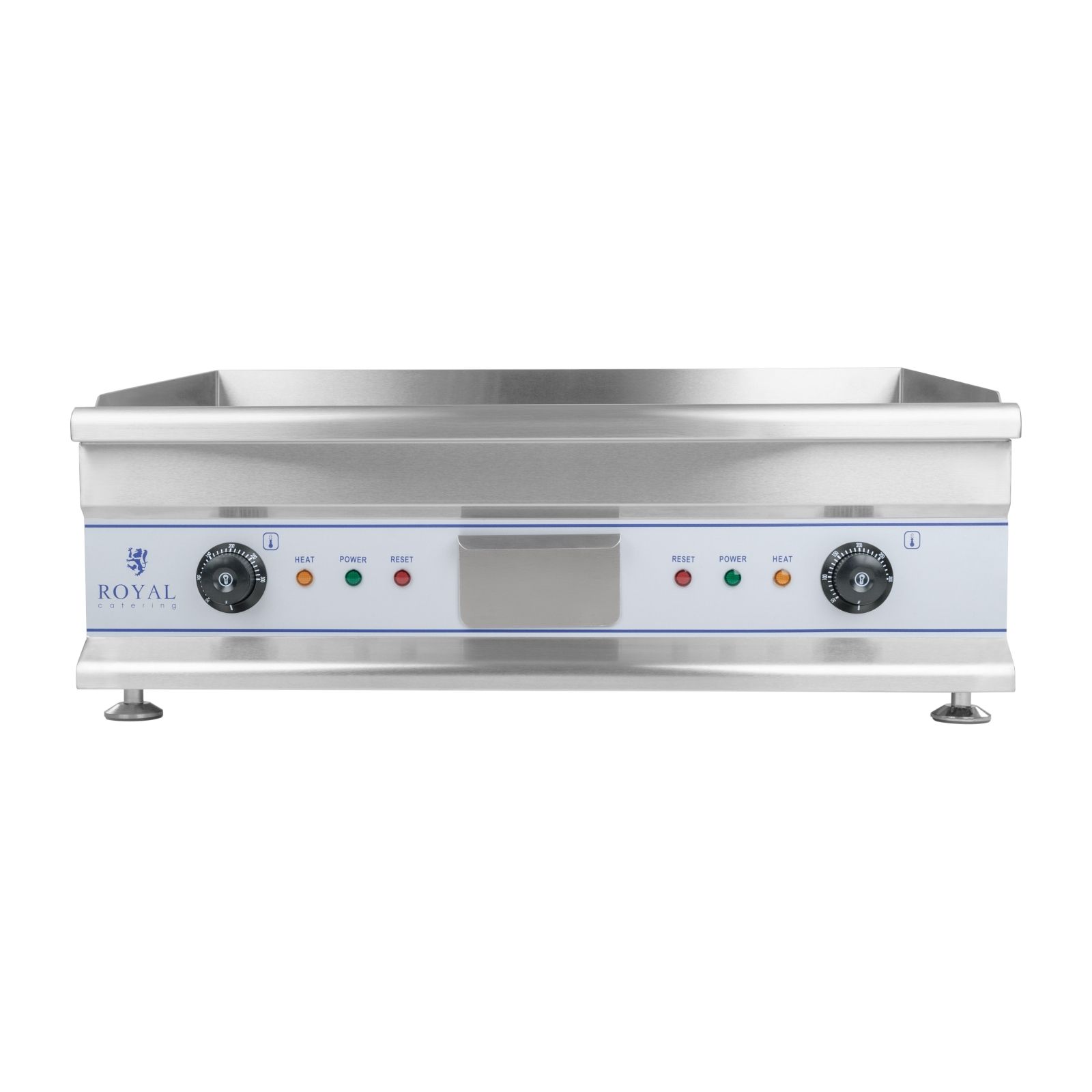 Grill dysponuje dużą płytą grzewczą o wymiarach 75 x 40 cm i grubości 12 mm, wykonaną ze stali węglowej, co zapewnia długotrwałe podtrzymywanie ciepła. Jego moc wynosi 2 x 3200 W, a każdy element grzewczy działa niezależnie, co pozwala na osiągnięcie temperatury w zakresie 50 - 300°C.