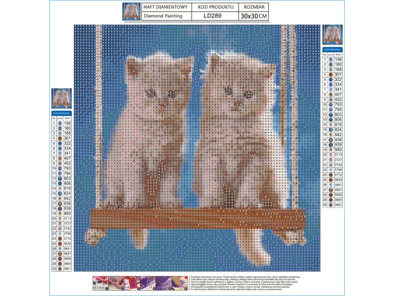 Oferowany zestaw zawiera wszystkie niezbędne elementy do wykonania gotowej układanki. Zabawa polega na tym aby odpowiednimi diamencikami wyłożyć ponumerowane płótno - tworząc w ten sposób dzieło sztuki - obraz.