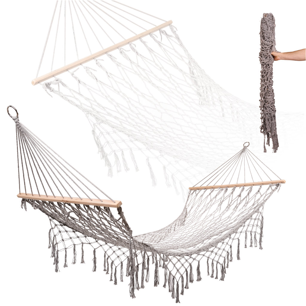 Wykonany z wysokiej jakości tkaniny (65% bawełna, 35% poliester), hamak zapewnia trwałość i elastyczność. Drewniany stelaż z 12 otworami mocującymi gwarantuje stabilność oraz bezpieczeństwo podczas relaksu.