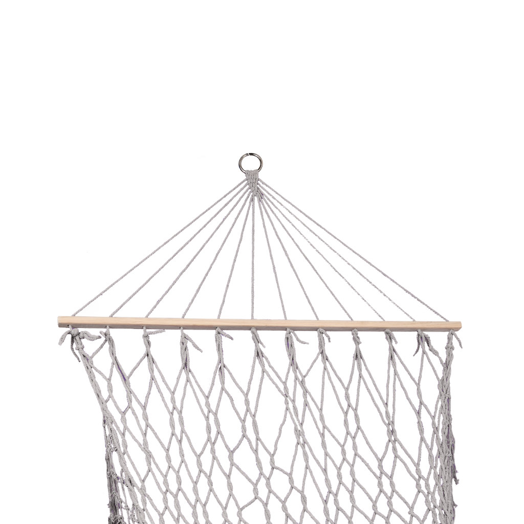 Hamak ma dużą powierzchnię leżenia 200 × 100 cm oraz maksymalne obciążenie do 150 kg. Idealnie sprawdzi się w ogrodzie, na tarasie czy balkonie, dodając przestrzeni charakteru.