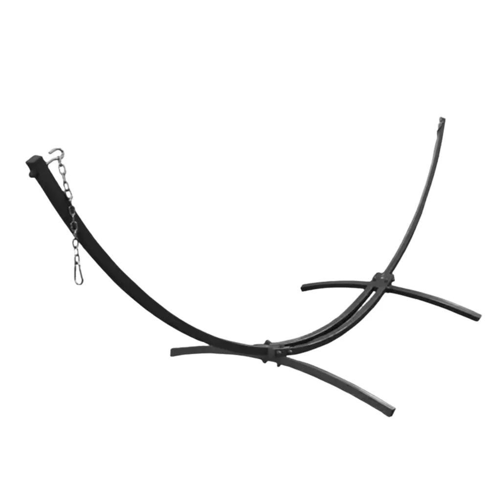 Stelaż wykonano ze stali poddanej procesowi piaskowania przed malowaniem proszkowym, co znacząco zwiększa odporność na uszkodzenia mechaniczne i warunki atmosferyczne. Specjalna konstrukcja stelaża pozwala na jego szybki montaż i demontaż po zakończonym sezonie. Stelaż wyposażono również w opatentowane stopki, które zwiększają powierzchnię styku z podłożem, chroniąc powierzchnię, na której stoi hamak, oraz same profile stalowe.