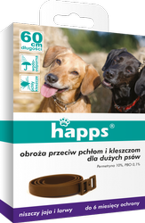 Obroża Happs przeciw pchłom i kleszczom dla dużych psów to skuteczna ochrona przed insektami. Produkt eliminuje insekty i zapobiega ich ponownej inwazji przez okres do 6 miesięcy. Dzięki swojej formule, nie zakłóca zmysłu powonienia psa, a dodatkowo jest odporna na wodę, co sprawia, że jest idealna do stosowania w różnych warunkach atmosferycznych.