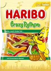 Spróbuj wyjątkowych żelek Haribo Crazy Python! Ta pyszna dwuwarstwowa mieszanka cukru i gumy owocowej zachwyca smakami, takimi jak Amazing Apple, Crazy Cola, Lucky Lemon, Paradise Peach, Royal Raspberry i Splashy Strawberry. Idealne na każdą okazję!