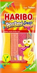 Odkryj nową, oryginalną przekąskę – Haribo Pasta Basta Sauer. To musujące wegańskie danie, które zaskoczy Twoje podniebienie. W opakowaniu znajdziesz pyszne paski o smaku coli, wiśni, maliny i tropików. Każdy kęs to eksplozja kwaśnych smaków, które umilą każdy moment.
