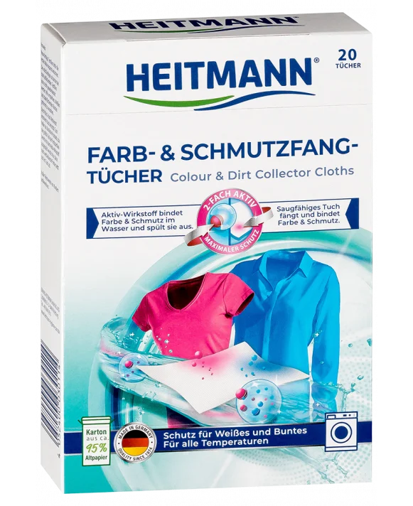 Chusteczki wyłapujące kolor i brud Heitmann to skuteczne rozwiązanie, które pomaga zachować intensywność kolorów Twoich ubrań. Dzięki nim unikniesz niepożądanych przesunięć barwników pomiędzy pranymi rzeczami oraz zminimalizujesz osadzanie się brudu na tkaninach. Twoje białe ubrania będą zachować śnieżnobiałą świeżość, a kolorowe tkaniny pozostaną żywe i intensywne.