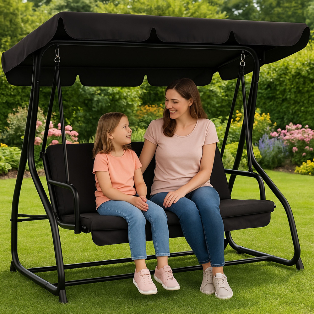 Stabilna, stalowa konstrukcja została pomalowana proszkowo, co zabezpiecza ją przed działaniem czynników zewnętrznych i zwiększa jej odporność na korozję. Dzięki maksymalnemu obciążeniu do 280 kg oraz dużej powierzchni siedziska huśtawka pomieści nawet cztery dorosłe osoby, zapewniając wygodę i bezpieczeństwo podczas użytkowania.
