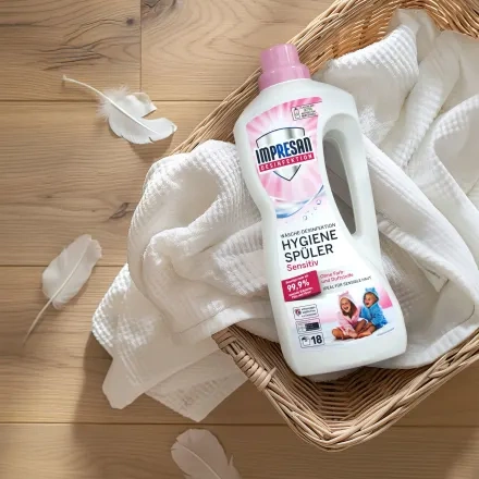 Nowoczesne tkaniny i delikatne rzeczy często można prać tylko w temperaturze 40°C. Ale możesz być pewien, że pranie jest wolne od zarazków podczas prania. Rozwiązaniem tego problemu jest IMPRESAN „Bez zapachów i barwników”. Zapewnia higienicznie czyste pranie już po jednym płukaniu, począwszy od prania na zimno. Nie zawiera żadnych substancji zapachowych, perfum i barwników. Jest przyjazny dla skóry i alergików. Kompatybilność skórna obrobionych tekstyliów została potwierdzona dermatologicznie.