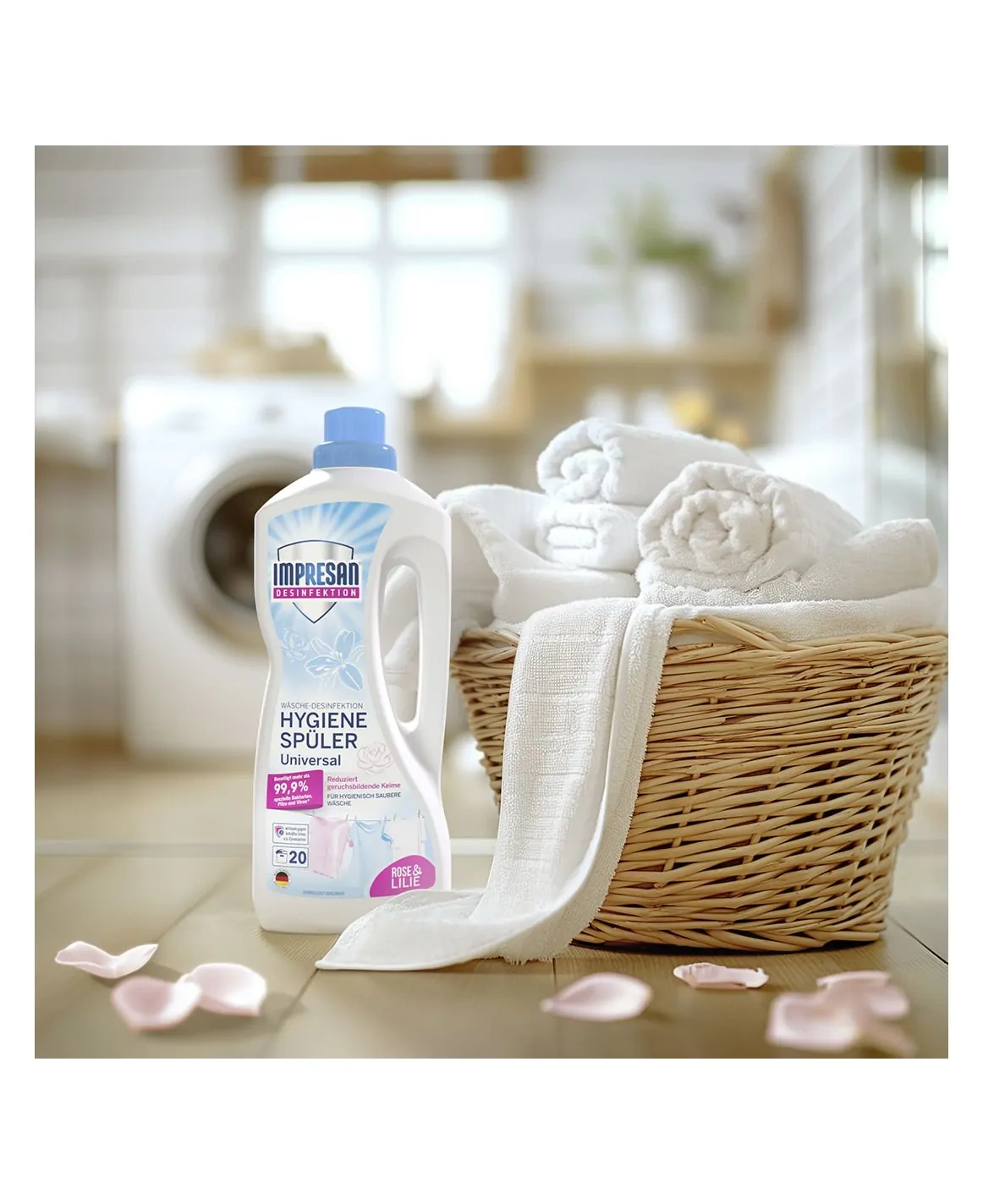 Impresan Rose & Lilie środek do higienicznego płukania prania, który usuwa ponad 99,9% bakterii, grzybów oraz wirusów. Skutecznie redukuje zarazki odpowiedzialne za nieprzyjemne zapachy, zapewniając długotrwałą świeżość. Delikatny zapach róży i lilii otula Twoje ubrania, nadając im subtelną elegancję.