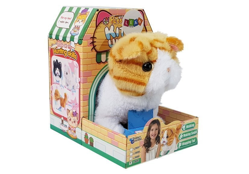 Kot jest biało rudy w paski z dużymi oczami, co dodaje uroku i nie można oderwać od niego wzroku. Kotek spaceruje, lub porusza się zwiększając tempo na szybsze. Dodatkowo otwiera pyszczek, porusza ogonkiem i wydaje dźwięki po pogłaskaniu po głowie. Wyjątkowy przyjaciel dla Twojego dziecka. Zabawa sprawi mu nie lada frajdę, a może i stworzy mały kącik kotku we własnym pokoju.