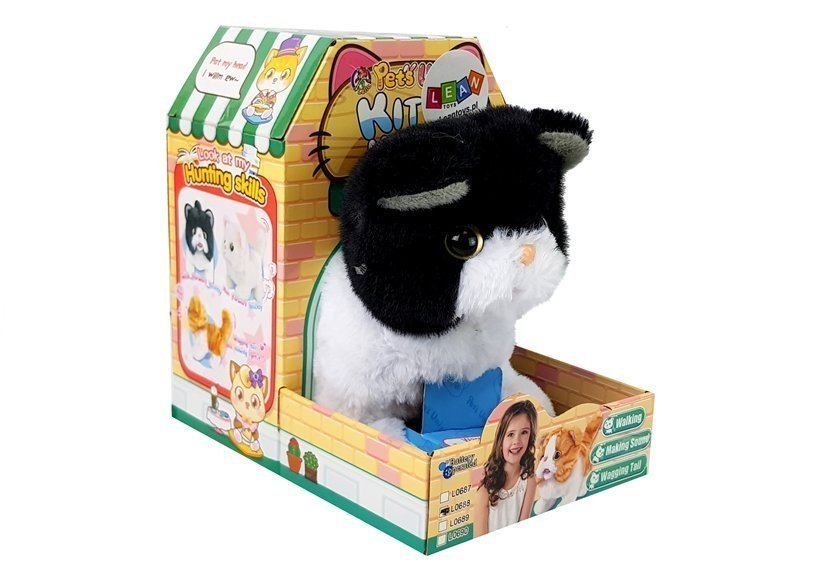 Czarno- biały puchowy kotek z dużymi oczami dodaje uroku i nie można oderwać od niego wzroku. Kotek spaceruje, lub porusza się zwiększając tempo na szybsze. Dodatkowo otwiera pyszczek, porusza ogonkiem i wydaje dźwięki po pogłaskaniu po głowie. Wyjątkowy przyjaciel dla Twojego dziecka. Zabawa sprawi mu nie lada frajdę, a może i stworzy mały kącik kotku we własnym pokoju.