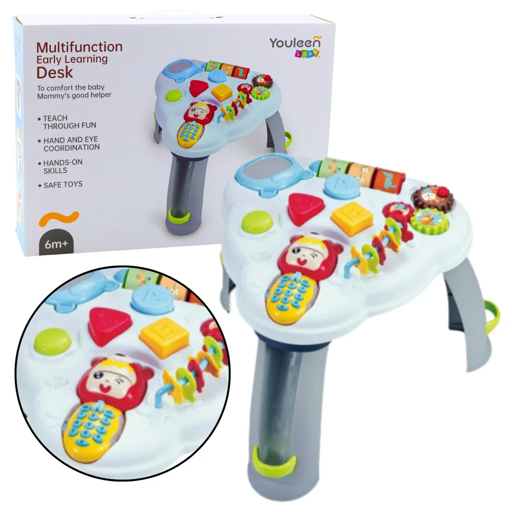 Stolik wyposażony jest w interaktywny telefon, który działa po włożeniu baterii. Telefon posiada kolorowe przyciski, które po naciśnięciu aktywują różne dźwięki i melodie, pobudzając ciekawość dziecka i zachęcając do odkrywania nowych bodźców.