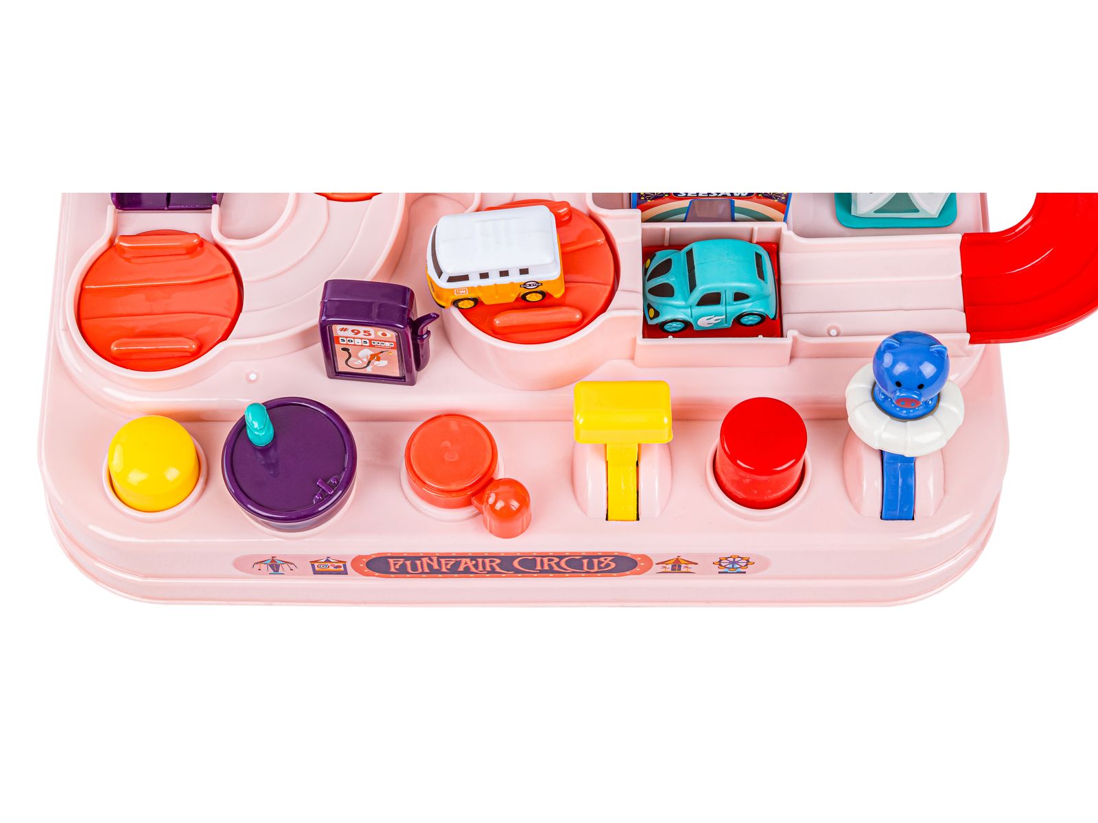 Przekonaj się jak wiele radości da Twojemu maluchowi zabawa tym niezwykłym torem. Kolorowy zjazd z pewnością przykuje uwagę i zachęci do zabawy. Aby pokonać cały tor przeszkód wystarczy zręcznie operować przyciskami i gałkami umieszczonymi na dole planszy.