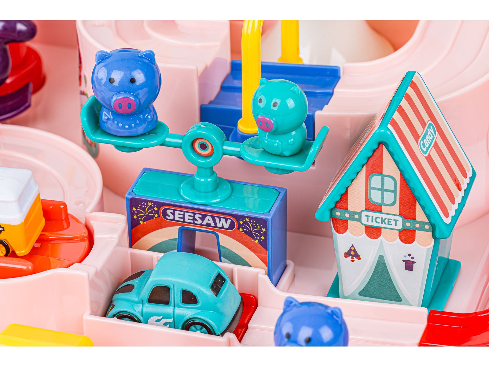 Tor przeszkód to zabawka pełna atrakcji - zaprojektowana w ten sposób aby przeprowadzić samochodzik aż do mety ale używając specjalnych przycisków! Samochodziki w trakcie "przeprawy" muszą nie raz zmienić kierunek jazdy, czy też pokonać m.in. zjeżdżalnię lub most zwodzony.