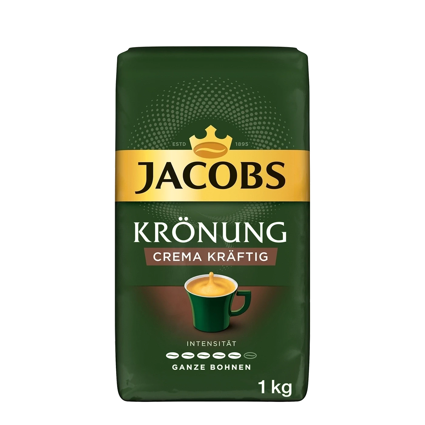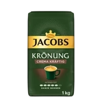 Jacobs Krönung Crema Kräftig to mocna, pełna charakteru mieszanka, ciemno palona w tradycyjnej palarni bębnowej. Dla miłośników kawy o intensywnym smaku, kawa to idealny wybór, oznaczony intensywnością 5 z 6 ziaren.