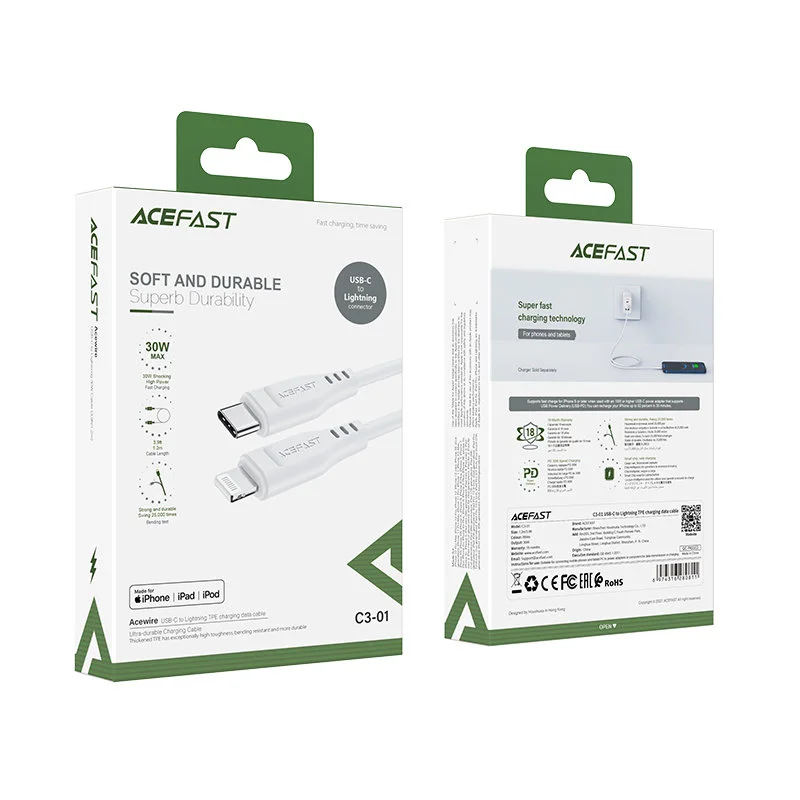 Kabel USB Typ C - Lightning marki Acefast to doskonałe rozwiązanie do ładowania i przesyłania danych dla urządzeń Apple. Dzięki niemu możesz szybko naładować swoje urządzenia.