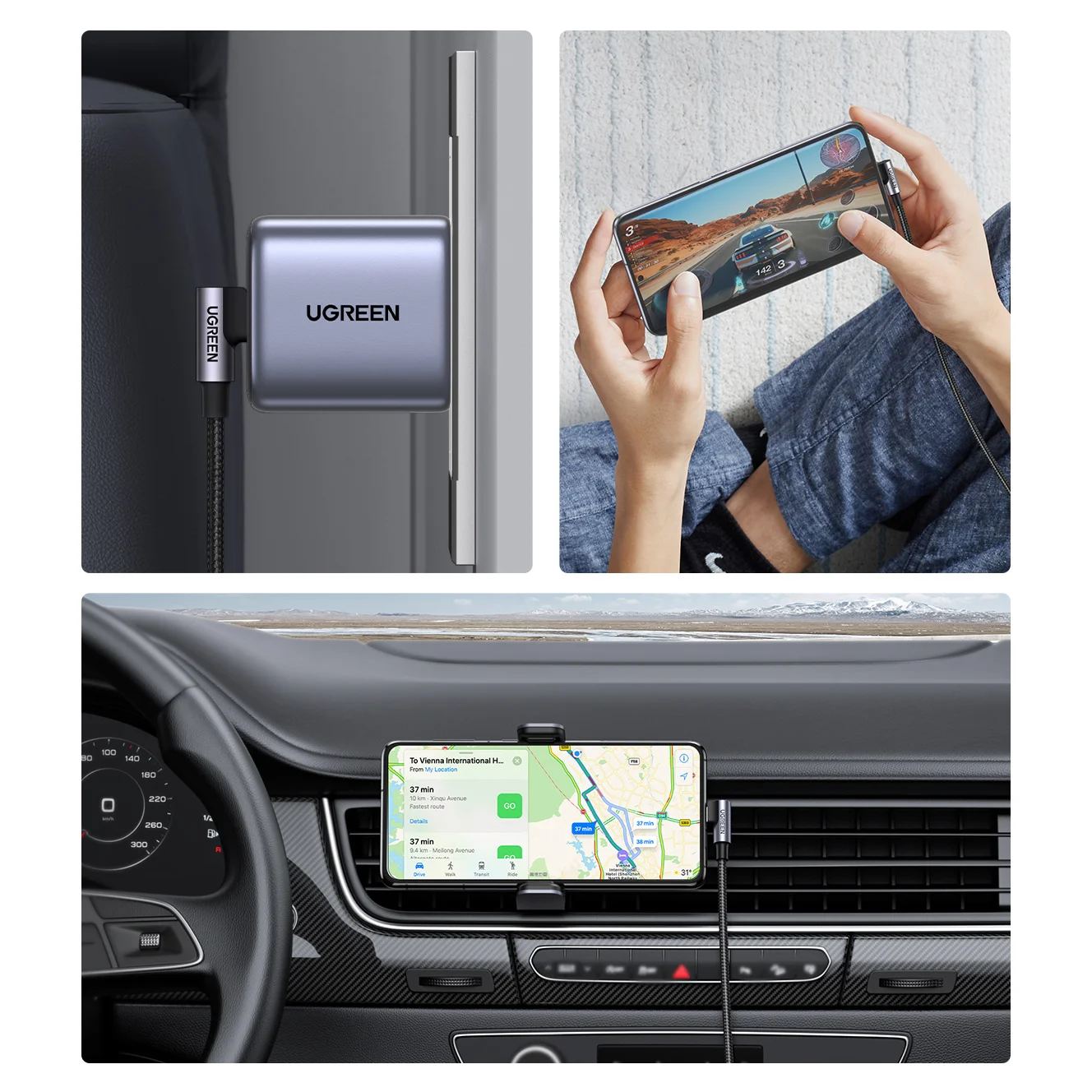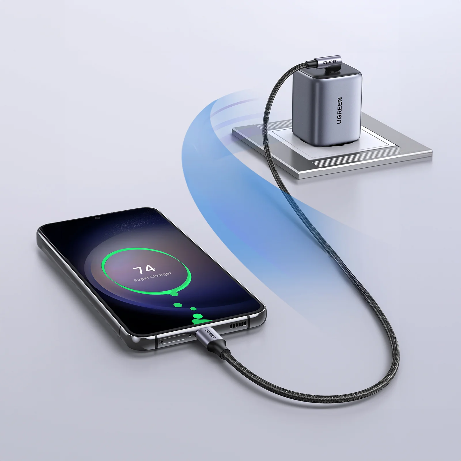 Wyposażony w kątowe złącze USB-C 90º, kabel Ugreen US255 ułatwia podłączanie w różnych warunkach. Nie musisz się już martwić o niewygodne manewrowanie kablem.
