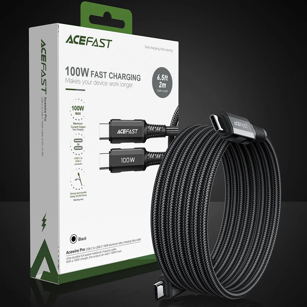 Zestaw zawiera: Kabel w oplocie USB-C 100W 20V 5A długości 2 m w kolorze czarnym.