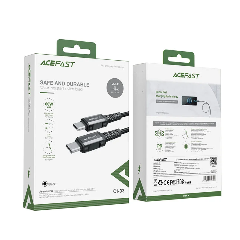 Kabel przewód w oplocie USB-C 60W 20V 3A 1.2m czarny to doskonałe rozwiązanie dla osób, które potrzebują szybkiego i efektywnego sposobu ładowania oraz transferu danych. Wykonany z wysokiej jakości materiałów, ten kabel marki Acefast został zaprojektowany z myślą o urządzeniach wyposażonych w złącze USB Typ C.