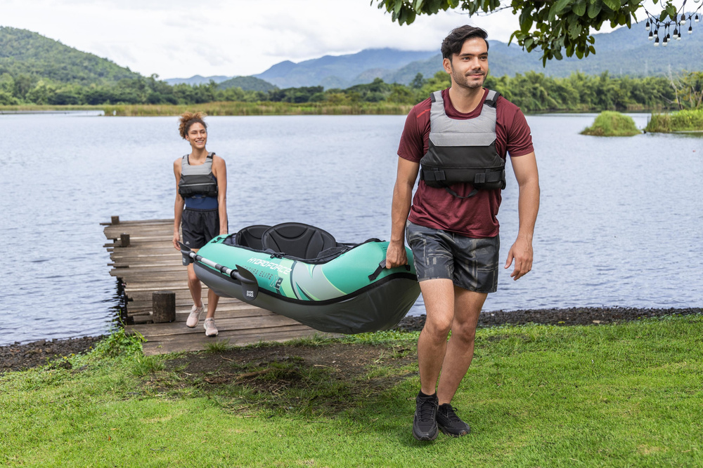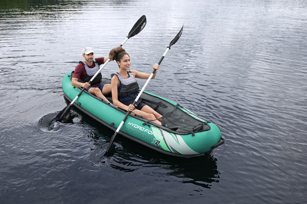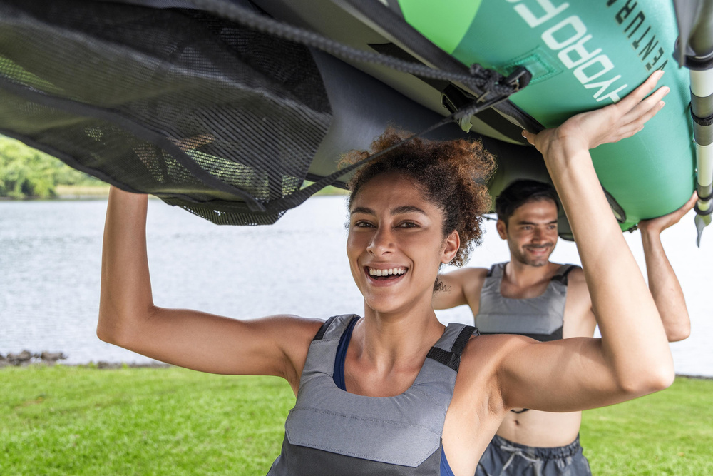 Wyjazd nad wodę to idealna forma spędzania wolnego czasu. Aby urozmaicić sobie ten beztroski czas zaopatrz się w dodatkowe akcesoria basenowe. Kajak idealnie sprawdzi się również podczas rekreacyjnej wycieczki po jeziorze lub basenie. Został wykonany z wytrzymałego winylu odpornego na uszkodzenia. Tkanina jest olejoodporna, wodoodporna i wytrzymuje intensywne promienie UV. Wysokiej jakości nylonowa powłoka jest również odporna na przebicie i zbudowana tak, aby wytrzymać szorstkie i często kamieniste wody rzeki. Będziesz mógł manewrować po krętych rzekach, jeziorach, spokojnych wodach otwartych lub odpływach i przypływach fal. Zaprojektowany z regulowanymi oparciami zapewniającymi wygodę i podparcie, Oprócz schowka umieszczonego w konstrukcji statku, jest również wyjmowana torba do przechowywania, która umożliwia aby mieć dostęp do niezbędnych rzeczy podczas wiosłowania po wodzie. Wiosła z podwójnym piórem są aluminiowe, lekkie i trzymane równo za pomocą bezpiecznych zatrzasków. Po całkowitym napompowaniu za pomocą ręcznej pompki kajak ma 2.80 m długości i może unieść do 200 kg . Posiada solidne płócienne uchwyty z każdej strony, dzięki czemu przenoszenie kajaka jest dziecinnie proste. Kajak ma zdejmowane płetwy, które pomagają zachować stabilność kierunkową i zwiększają prędkość. W celu przechowywania wystarczy odłączyć płetwy od kajaka, aby uzyskać ultra kompaktowy, oszczędzający miejsce element.