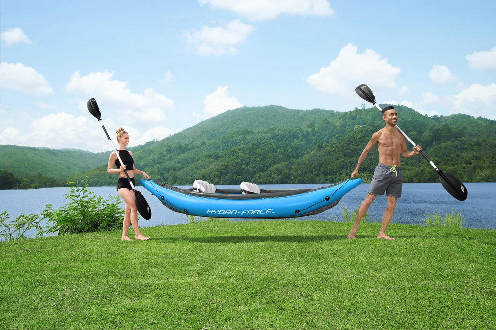 Wyjazd nad wodę to idealna forma spędzania wolnego czasu. Aby urozmaicić sobie ten beztroski czas zaopatrz się w dodatkowe akcesoria basenowe. Kajak idealnie sprawdzi się również podczas rekreacyjnej wycieczki po jeziorze lub basenie. Został wykonany z wytrzymałego winylu odpornego na uszkodzenia. Wygodny kokpit ma dwa nadmuchiwane fotele z miękkimi oparciami, aby zapewnić wygodę podczas długich przejażdżek. Wyjmowana środkowa płetwa pomaga zachować stabilność kierunkową. Dopasowana do kształtu konstrukcja zapobiega przedostawaniu się wody do kokpitu i zanurzeniu Ciebie lub Twojego sprzętu. Lina do chwytania z wbudowanymi przelotkami umożliwia łatwe ponowne wejście do kajaku z wody. Zintegrowany zawór spustowy ułatwia spuszczenie powietrza z kajaka pod koniec dnia. Można też użyć wytrzymałych uchwytów do przenoszenia kajaka gdy jest napompowany. Otrzymasz również parę aluminiowych wioseł o długości 230 cm i łatkę naprawczą do naprawienia przypadkowego otarcia lub nakłucia.