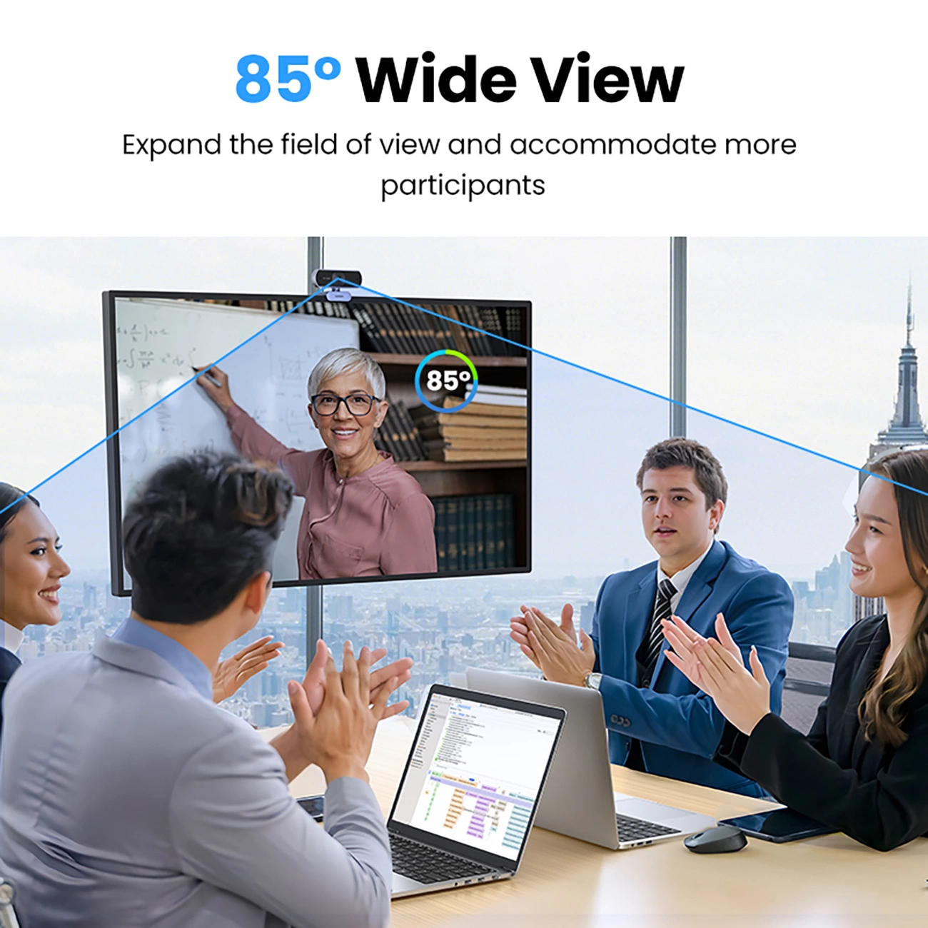 Kamera oferuje szeroki kąt widzenia 85 stopni, co umożliwia umieszczenie w kadrze większej liczby osób. Dodatkowo, rotacja 360 stopni oraz trzy opcje instalacji – na stole, na statywie lub zamocowana na górze komputera – zapewniają dużą elastyczność w użytkowaniu.