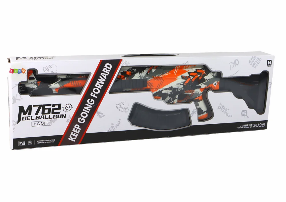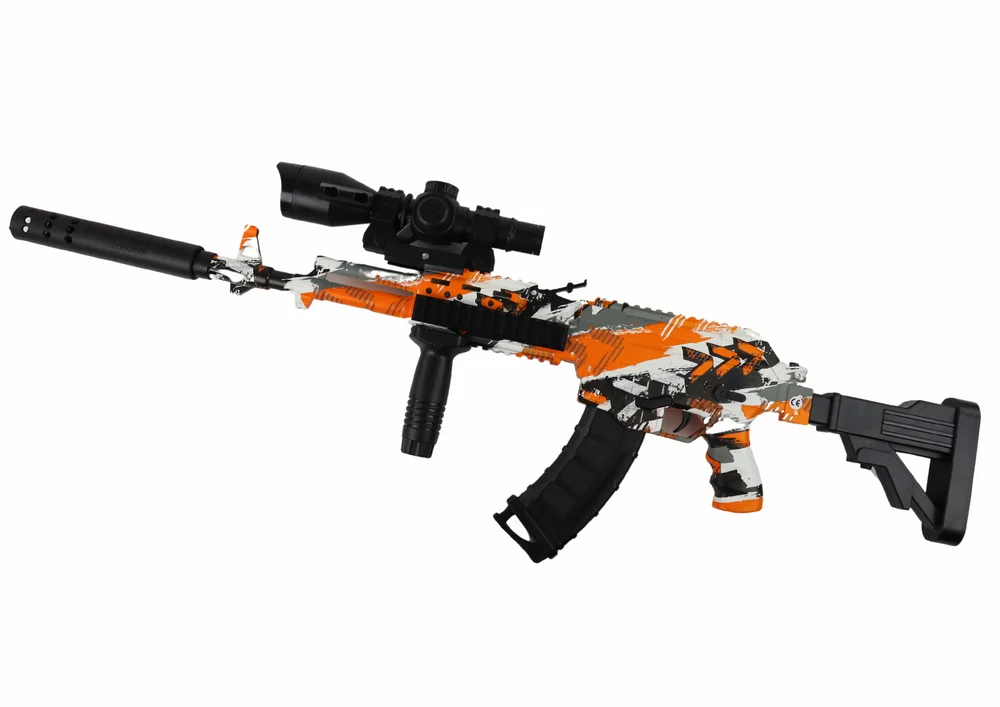 Karabin AMT na kulki żelowe to nowoczesna interaktywna zabawka, która dostarcza mnóstwo emocjonującej rozrywki i długotrwałej zabawy. Dzięki imponującej długości 77 cm, broń prezentuje się realistycznie i efektownie, sprawiając, że każdy miłośnik gier taktycznych poczuje się jak prawdziwy strzelec. Karabin został ozdobiony dynamicznym pomarańczowo-szarym wzorem z czarnymi akcentami, co nadaje mu nowoczesny i przyciągający wzrok wygląd.