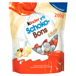 Kinder Schoko-Bons White to wyjątkowe połączenie białej czekolady i pysznego mlecznego nadzienia. W środku znajdziesz chrupiące orzechy laskowe, które dodają niepowtarzalnego smaku. Te cukierki są idealne na każdą okazję – doskonale sprawdzą się w podróży, podczas spotkań towarzyskich lub jako słodka przekąska dla siebie.