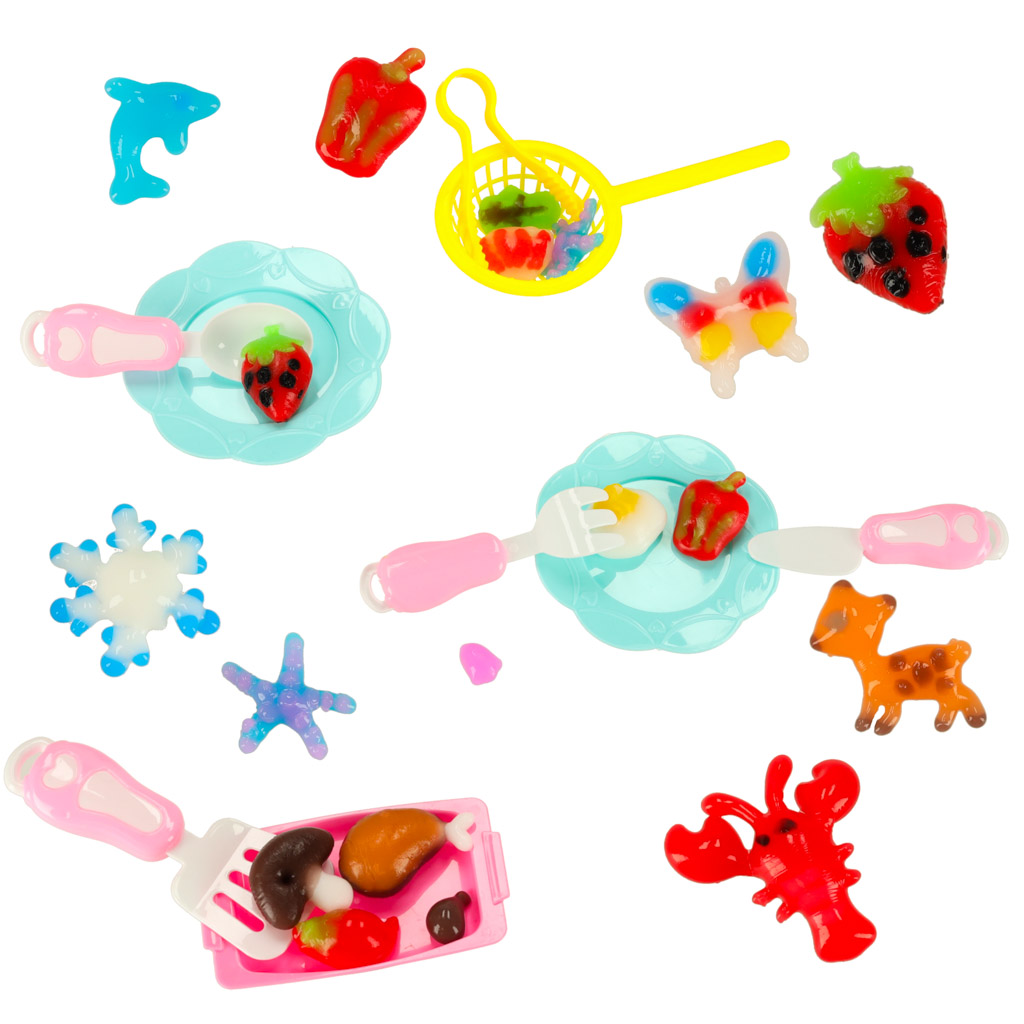 Tworzenie figurek jest proste! Wypełnij foremki kolorowym żelem, zanurz je w specjalnym płynie i obserwuj, jak powstaje miękka i elastyczna figurka. Dodatkowo, garnuszek posiada efekty świetlne i dźwiękowe, co sprawia, że zabawa staje się jeszcze bardziej ekscytująca!