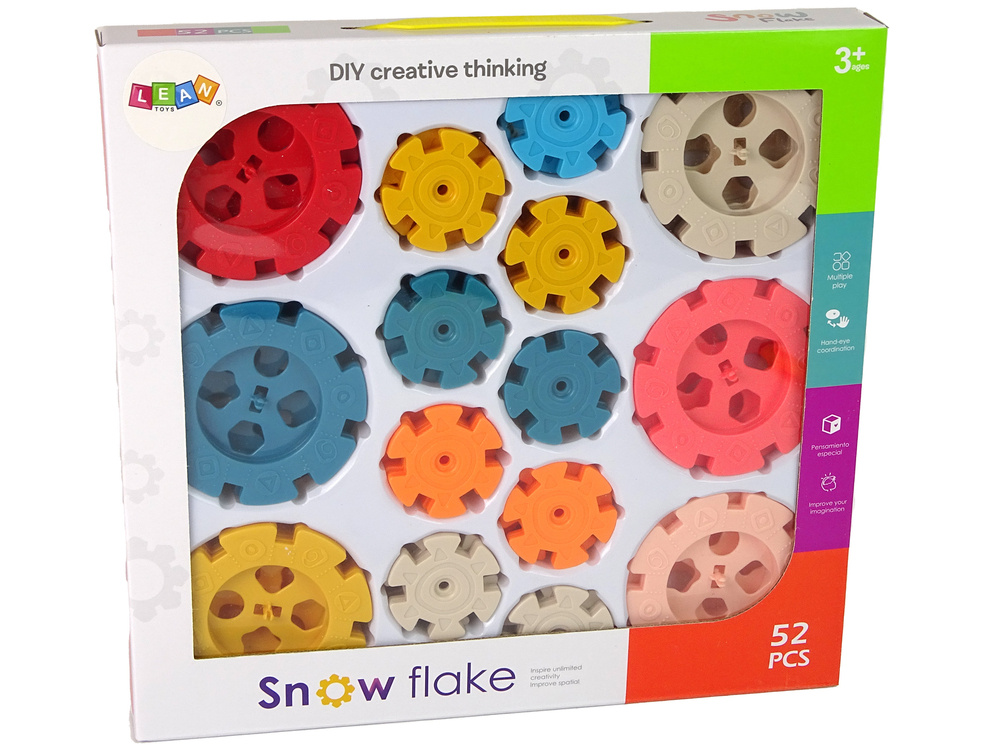 Cały zestaw zawiera 52 sztuki, płatki śniegu występują w różnych kolorach i wielkościach. Budowanie konstrukcji i projektowanie angażuje malucha i pozwala kreatywnie spędzać wolny czas. W środku znajduje się ulotka z przykładami, jakie budowle możesz stworzyć.