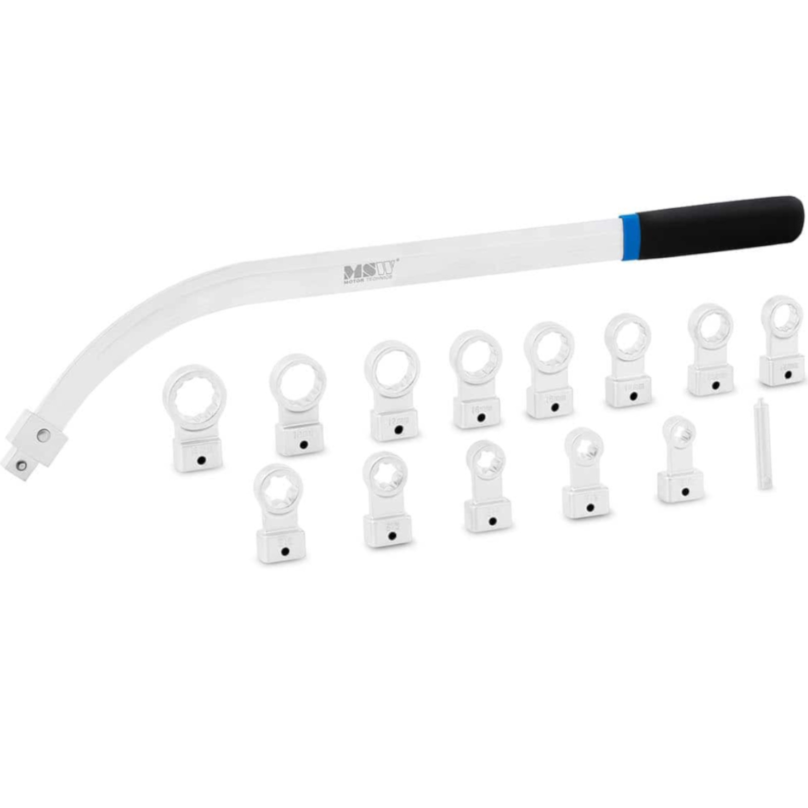W skład zestawu wchodzi 13 kluczy, co pozwala na szerokie zastosowanie. Zakrzywiona rękojeść ułatwia manewrowanie narzędziem, nawet w ciasnych przestrzeniach.