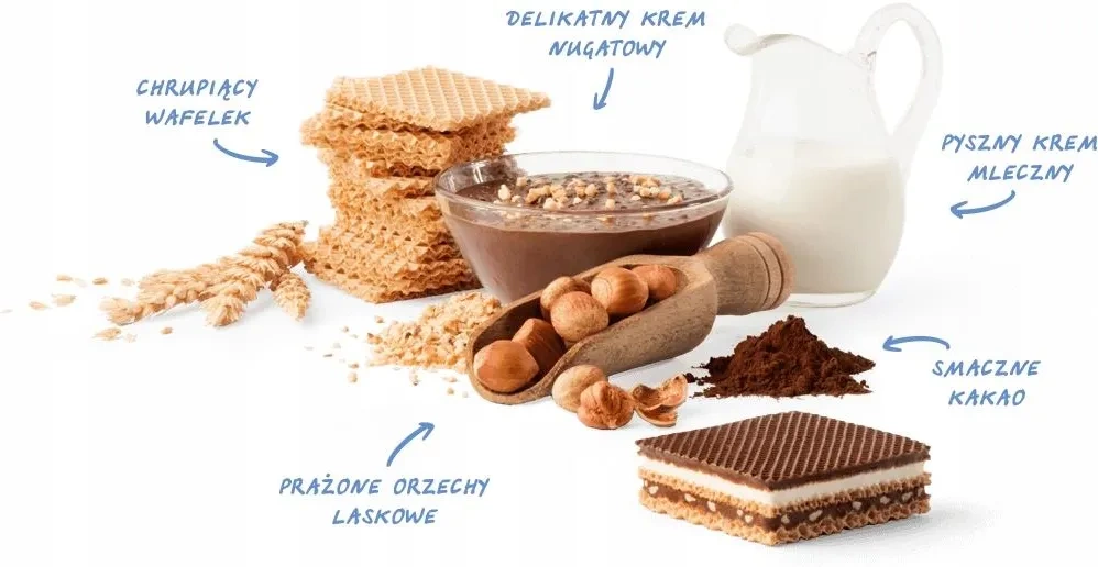 Składniki: Cukier, tłuszcze roślinne (palmowy, shea), odtłuszczone mleko w proszku* (13,5%), MĄKA PSZENNA (12,3%), ORZECHY LASKOWE (9,1%), MĄKA PSZENNA PEŁNOZIARNISTA (6,1%), kakao, TŁUSZCZ MAŚLANY* (2,6%), kakao odtłuszczone, STRZYK PSZENNY, EMULGATOR LECYTYNY (SOJA), PRODUKT SERWATKOWY, ŚMIETANA W PROSZKU* (0,2%), sól, naturalne aromaty, substancja spulchniająca wodorowęglan sodu, mielone ORZESZKI
