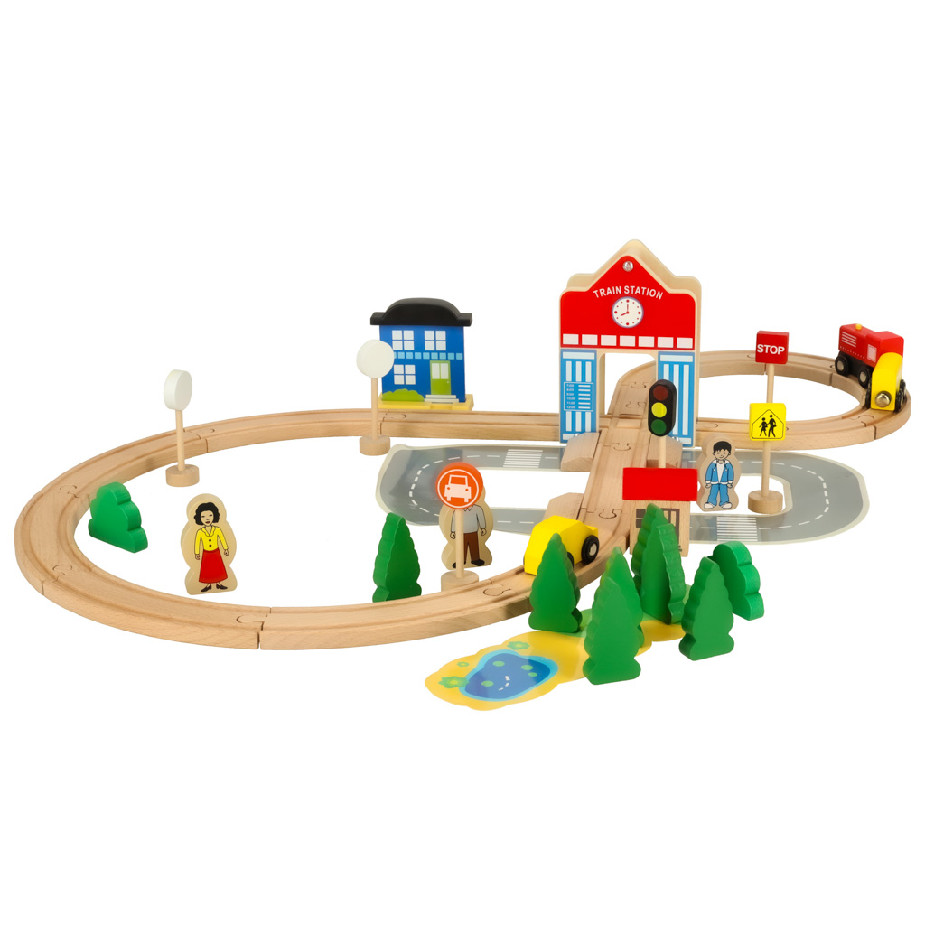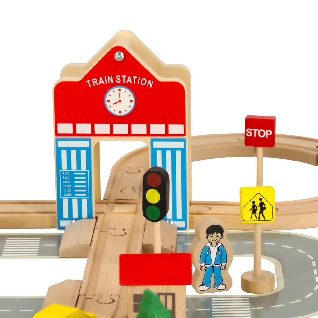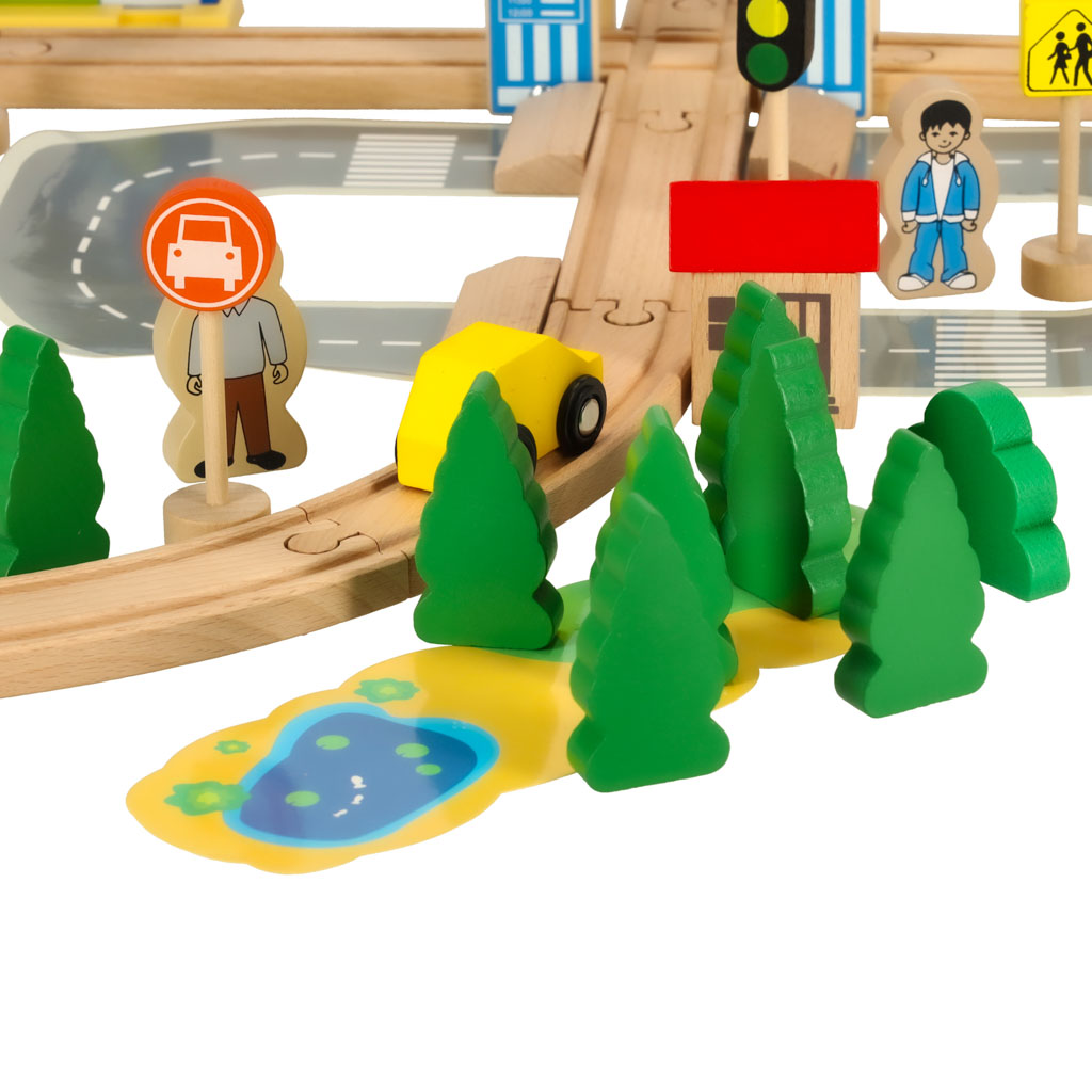 Oprócz torów, w zestawie znajdują się pociąg z wagonem, samochód, budynki, figurki i dekoracje miasta, które można ustawiać w dowolny sposób, tworząc własne miasteczko. Układanie torów wymaga logicznego myślenia oraz umiejętności rozwiązywania problemów, co jest doskonałym treningiem zdolności manualnych.