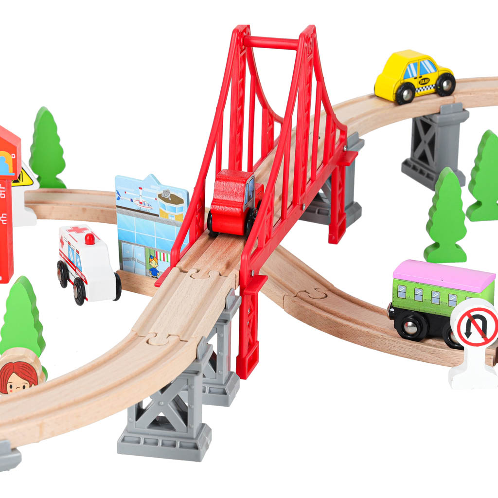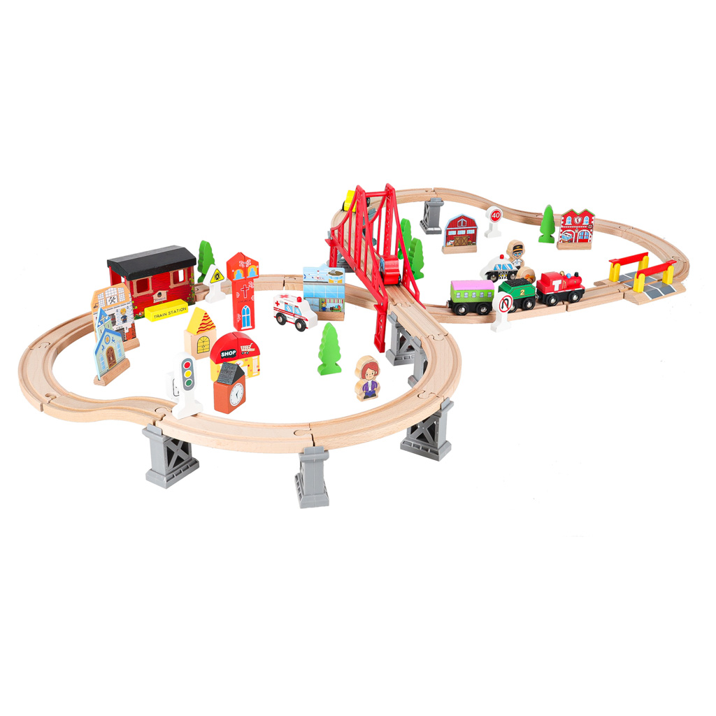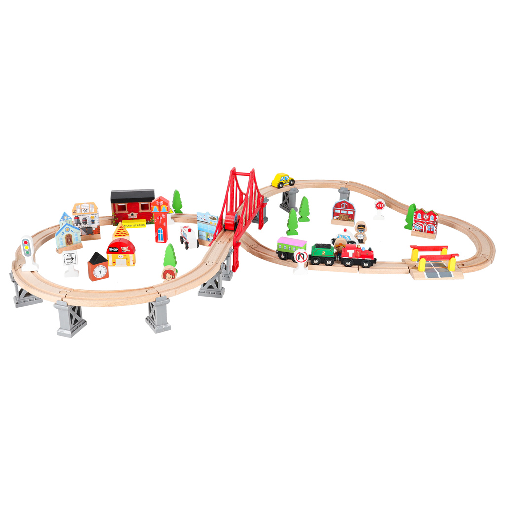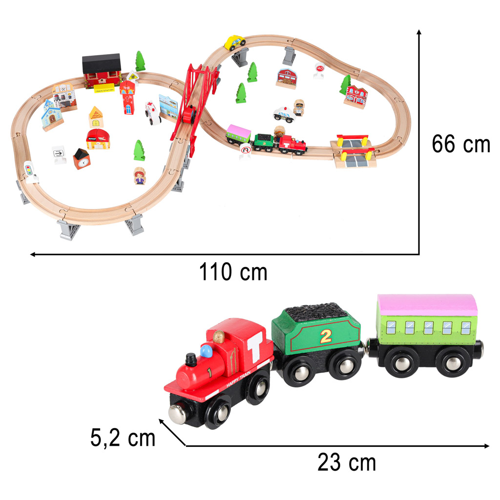 Drewniana kolejka to idealna zabawa dla najmłodszych. Zestaw składa się z 70 elementów, które pozwalają na stworzenie różnorodnych krajobrazów. Kolorowe klocki rozweselą każde dziecko i zapewnią godziny kreatywnej rozrywki.