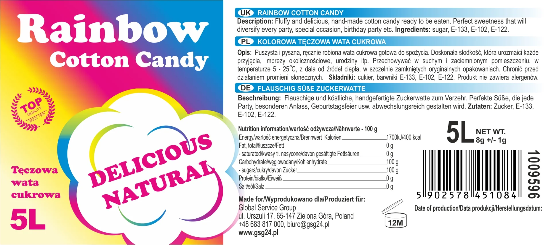 Wata cukrowa dostępna jest w praktycznym wiaderku o pojemności 5 litrów. Takie opakowanie: