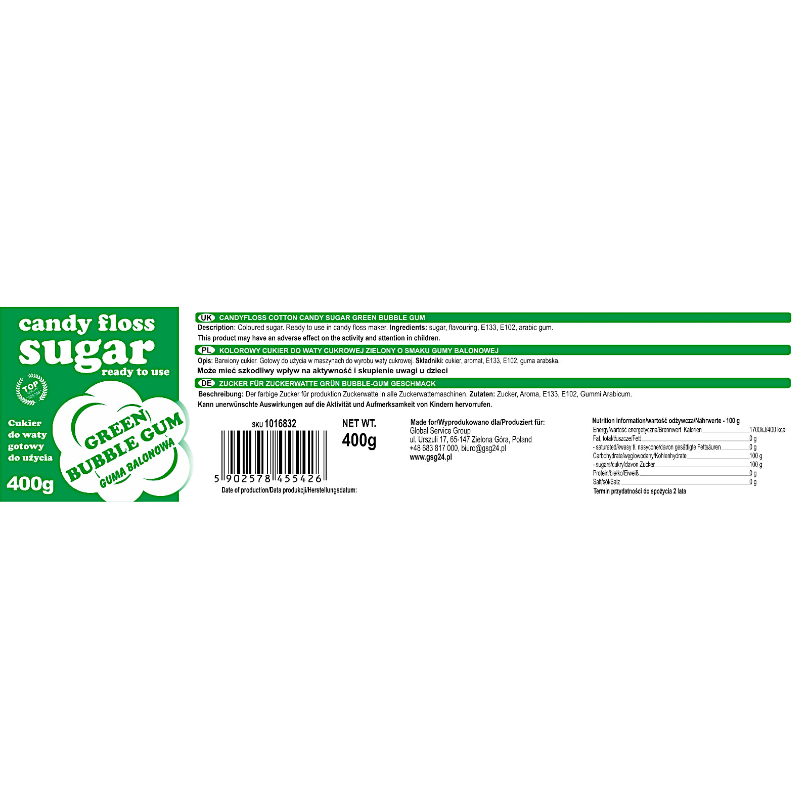 Produkt jest gotowy do użycia w maszynach do wyrobu waty cukrowej. Opakowanie o wadze 400 g zapewnia dużą ilość cukru, co sprawia, że jest doskonałym rozwiązaniem na większe wydarzenia.