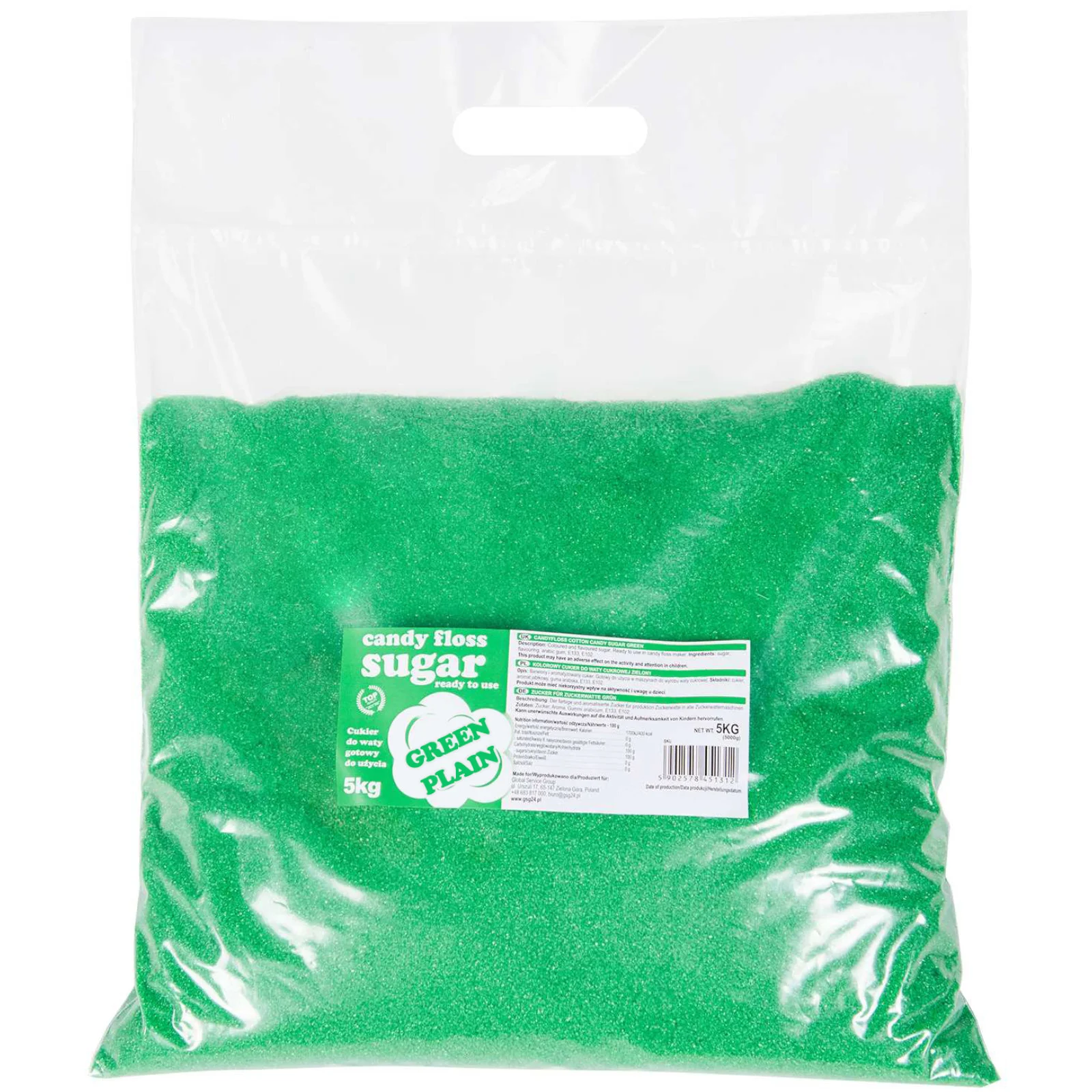 Nasza oferta obejmuje kolorowy cukier do waty cukrowej w intensywnym zielonym odcieniu. Jest to produkt, który sprawdzi się doskonale w maszynach do wyrobu waty cukrowej, idealny na różnorodne imprezy i festyny.